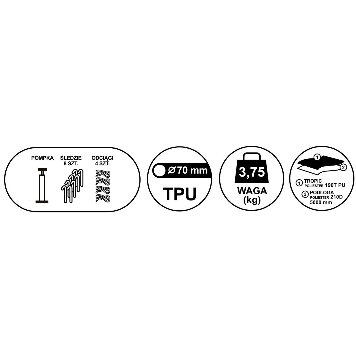 • Material: 190T/PU1000mm Ripstop polyester – tent, floor – 210D 5000mm polyester, 210D 1500mm polyester canopy, 70mm TPU inflatable tubes.