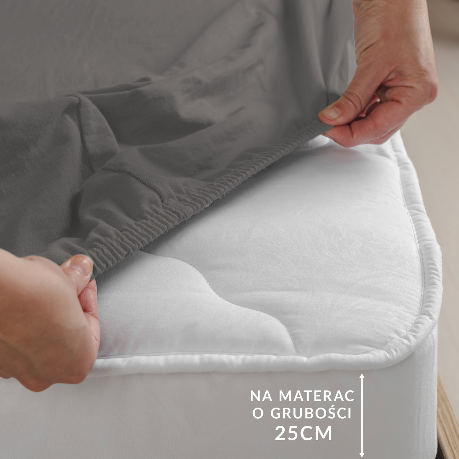 The sheets are made of the highest quality cotton knitted fabric with the addition of elastane. Jersey weave and the addition of elastane makes the knitted fabric not piling, very soft and elastic, and the sheet perfectly adapts to the mattress. It does not require ironing. For a long time it retains its qualities of use. The elastic is sewn around the entire perimeter of the sheet. They fit a mattress up to a height of 25cm.