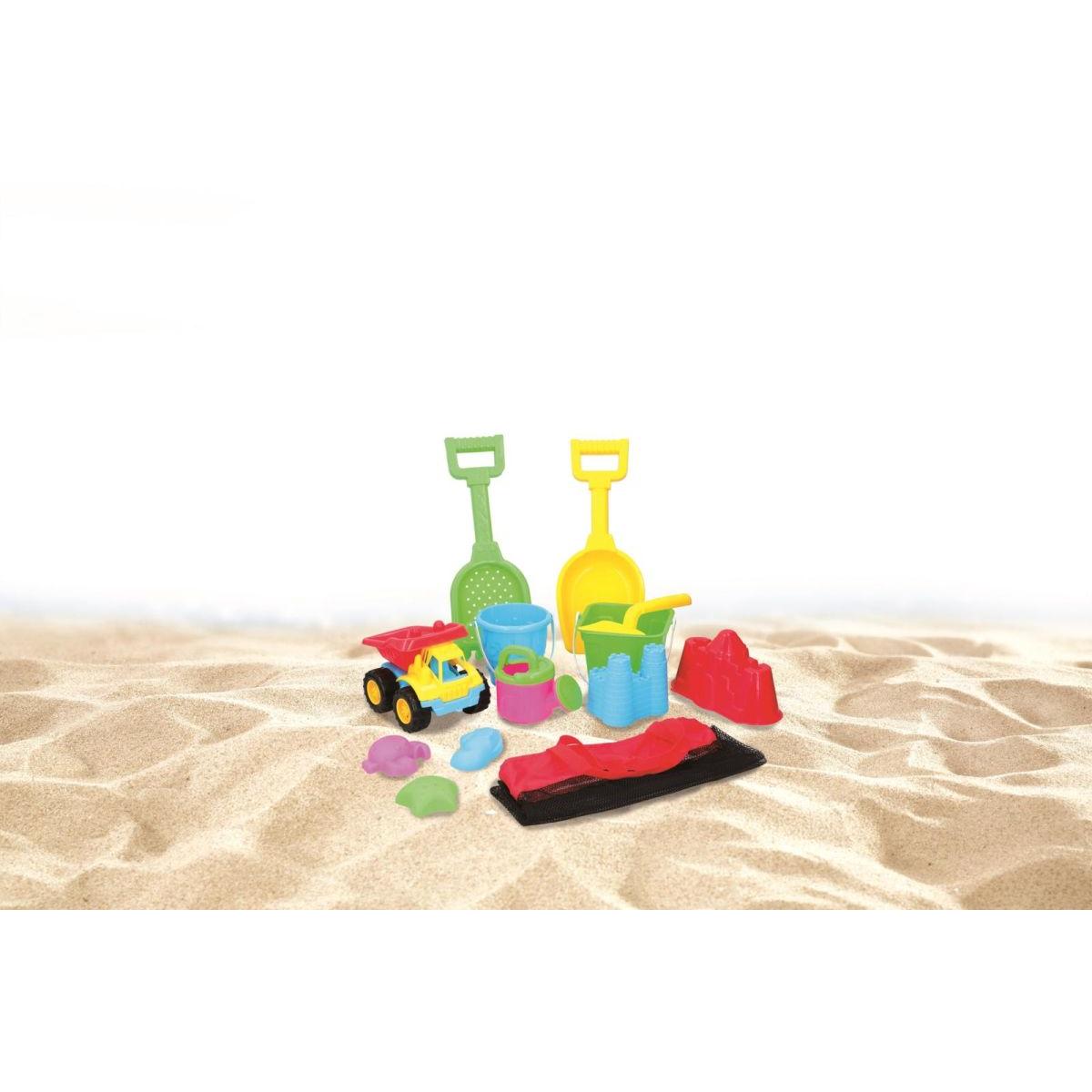 The 13-piece beach set is not just a shovel and bucket – it’s a complete sand dream factory: a dump truck, watering can, molds and more!