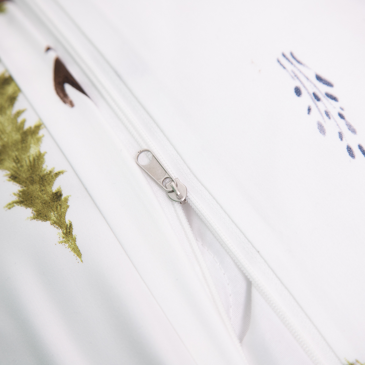 The bedding is double-sided. On one side it has a solid light brown color. On the other, the white background is decorated with a delicate pattern with a winter mood, the composition of which consists of reindeer, a wooden house with a snowy roof and coniferous trees. The bedding measures 200 x 220 cm. The set also includes two pillowcases measuring 70 x 80 cm. The pillowcases for both duvet and pillows are closed with zips.