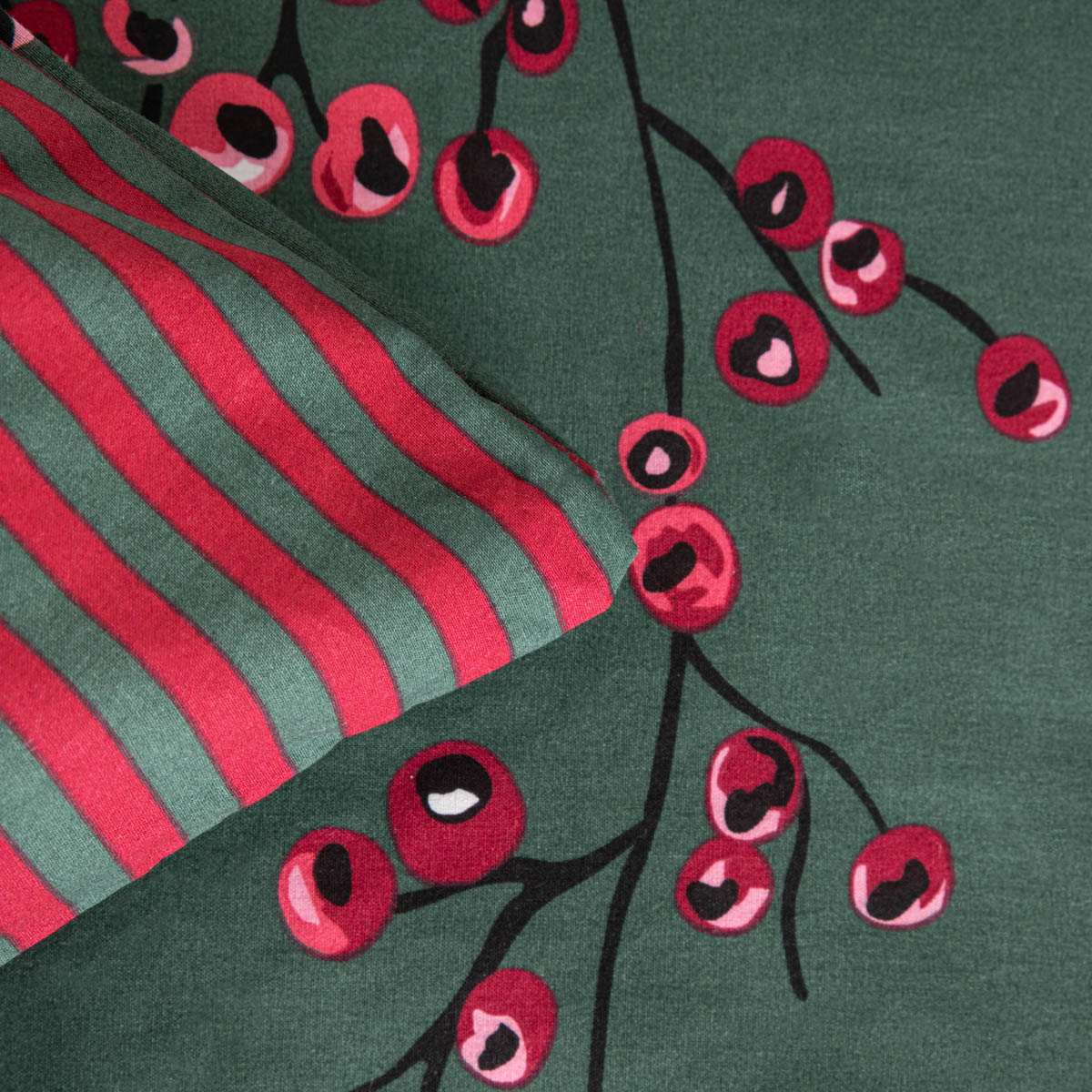 The double-sided bedding has a colorful, festive design – a pattern with sprigs of holly on a green background on one side and green and red stripes on the other. Red and green are timeless festive colors that will blend perfectly into any seasonal setting. Cotton bedding with a festive pattern is a beautiful decoration for your bedroom.