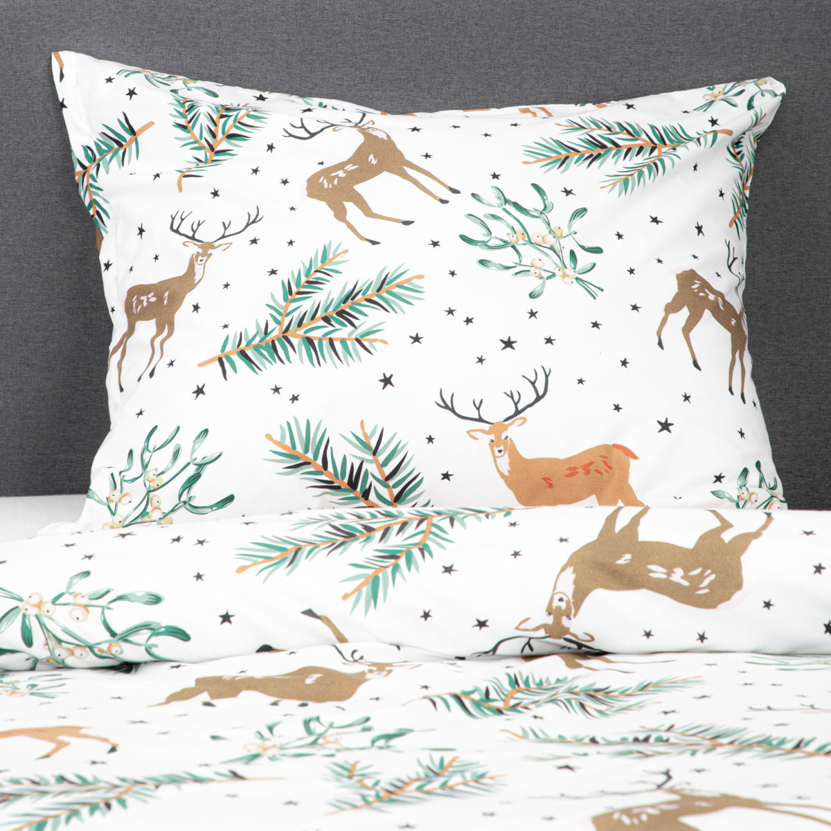 The LANDSKAB bedding set is a festive product in this edition, measuring 160 x 200 cm. The set also includes 2 pillowcases measuring 70×80 cm. The entire length of the bedding features a charming pattern consisting of a white background with reindeer on it, together with Christmas branches. The ornaments are made in brown and green colors.