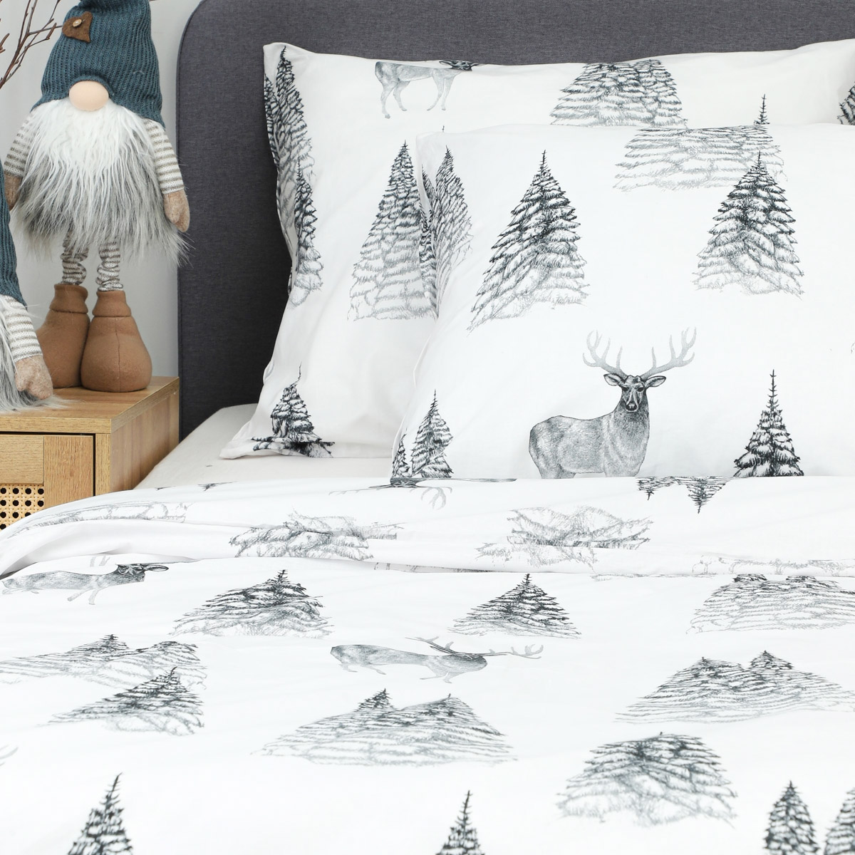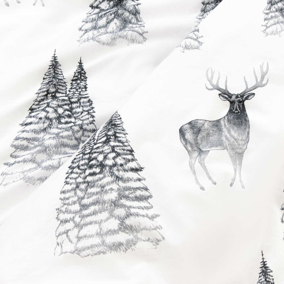 The MUNTI bedding set consists of a 160 x 200 cm pillowcase and two 70 x 80 cm pillowcases. The figures of moose and a Christmas tree have been placed on a white background. The black sketches look as if they have been painted in pencil. This is the way to a pleasant night’s sleep, not only during the holidays.