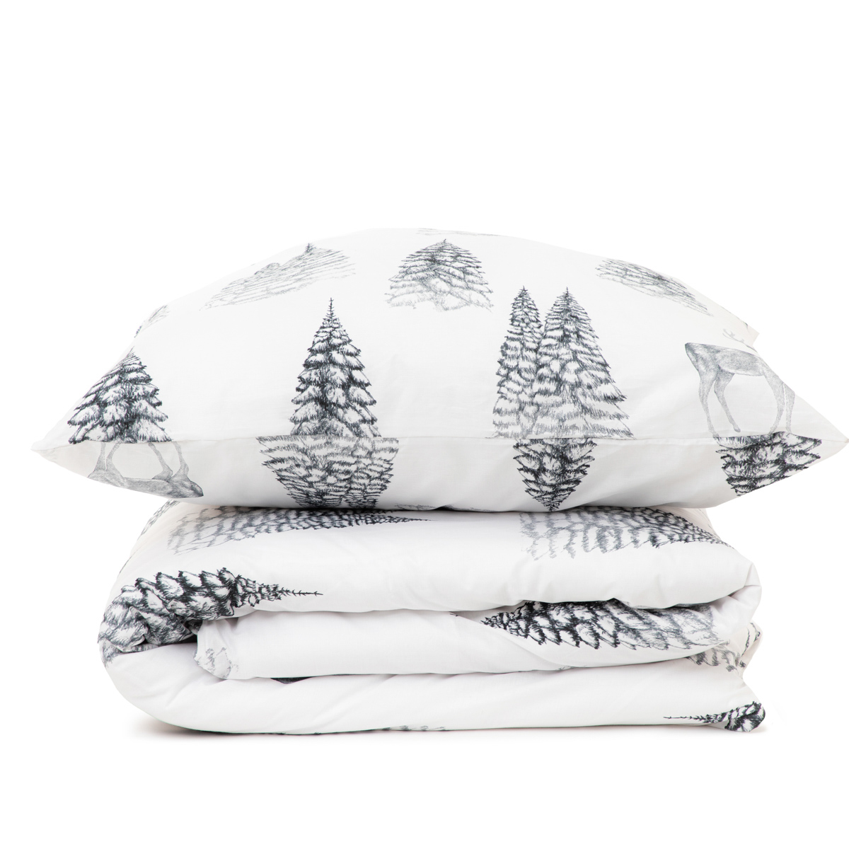 The MUNTI bedding set consists of a 220 x 200 cm bedding pillowcase and two 70 x 80 cm pillowcases. The zip of the duvet cover is sewn on the longer side. The figures of moose and a Christmas tree have been placed on a white background. The black sketches look as if they have been painted in pencil. This is a way to have a pleasant night’s sleep not only during the holidays.
