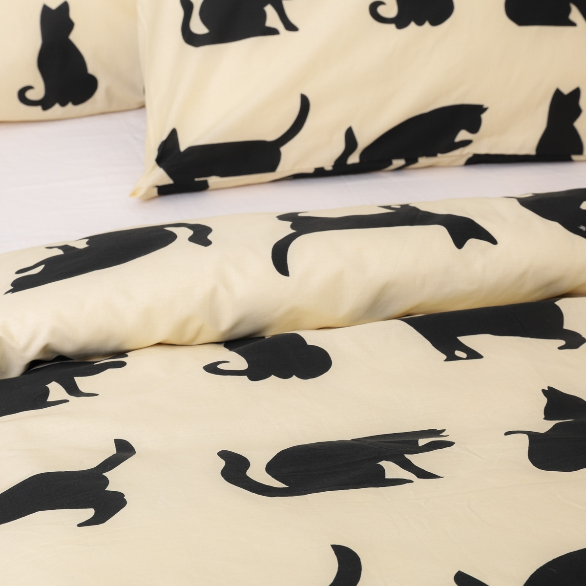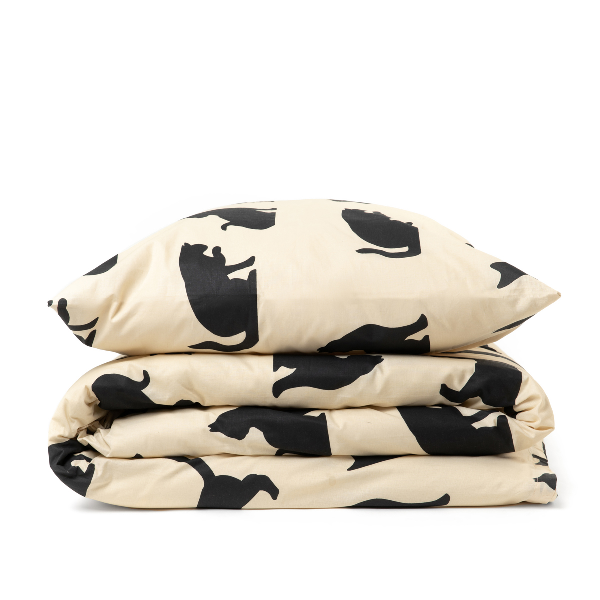 The POES bedding set consists of a 160 x 200 cm pillowcase and a 70 x 80 cm pillowcase. Various cats in black have been placed on a beige background, The beige and black color scheme of the bedding makes it very versatile and will fit into many arrangements.