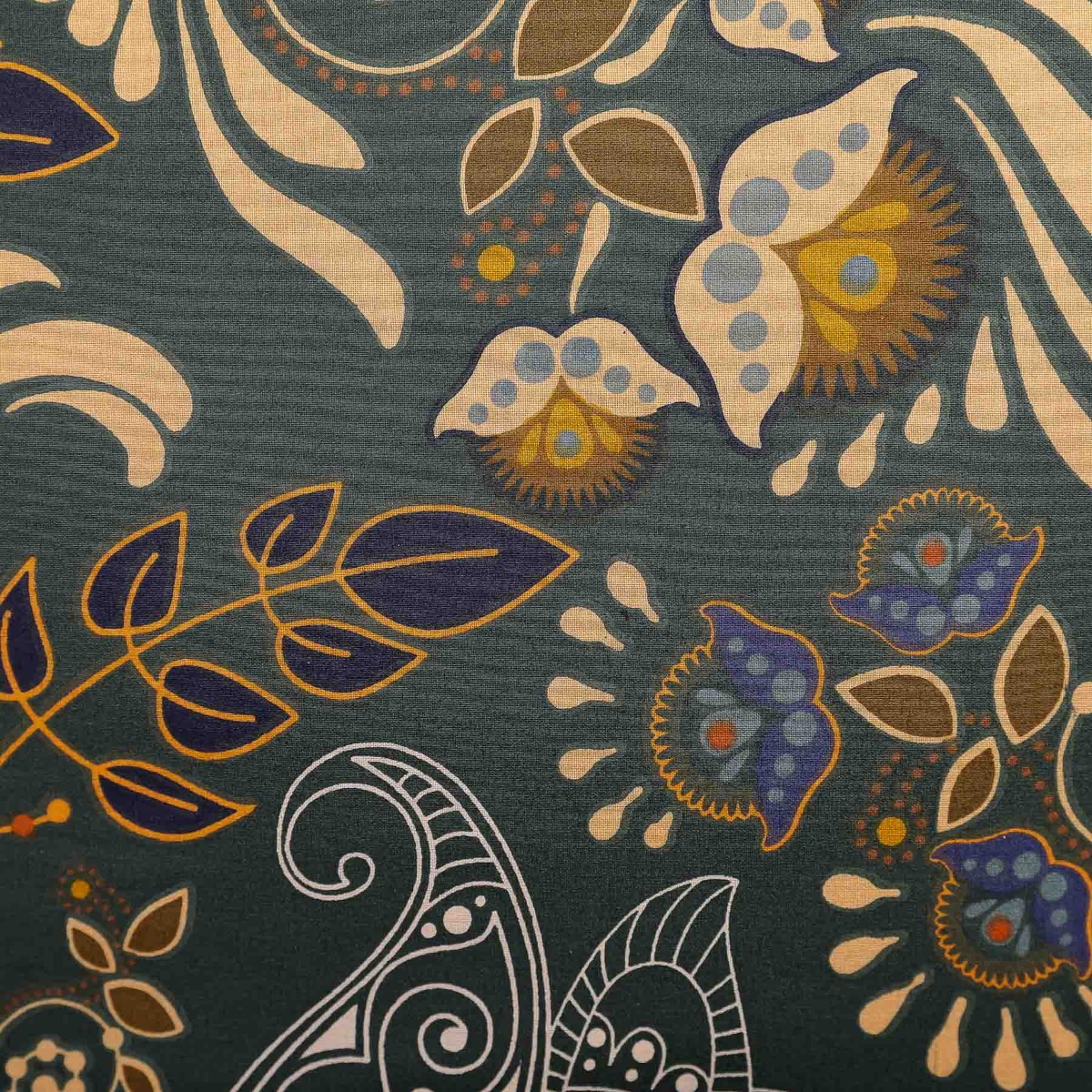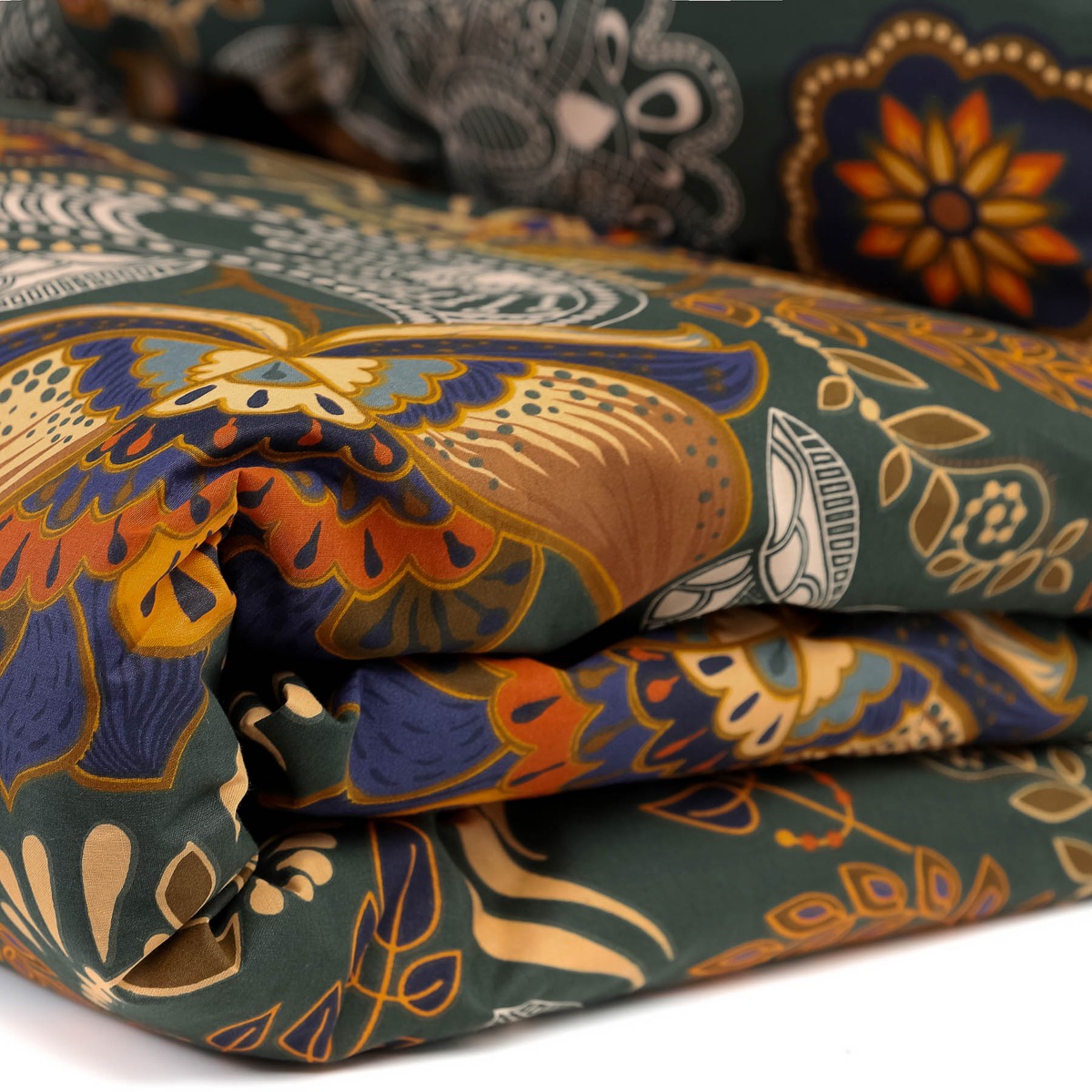 TAUPA set is a product for a bed of 160 x 200 cm. It has a background in rotten green with a multicolored oriental pattern. Its design consists of leaves and in flowers made in various original shapes. The set includes a pillowcase for bedding and pillowcases for two pouches.