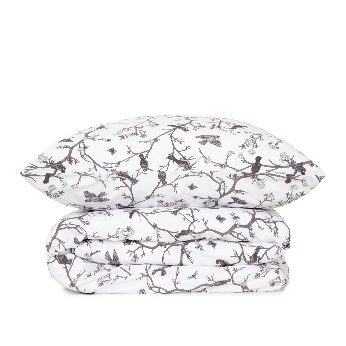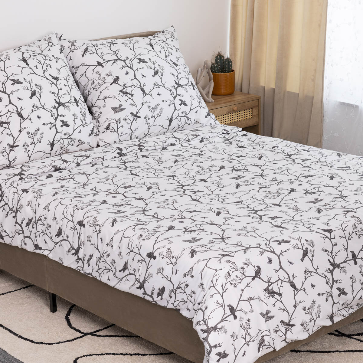 The bedding set has a pure white background, decorated with a plant-animal motif in the form of small tree branches, leaves and flowers, around which small birds fly or sit, in grey. The material of the product is soft, light and guarantees a comfortable rest. The bedding set consists of a 160 x 200 cm duvet cover and two 70 x 80 cm pillowcases. The pillowcases are closed with zips.