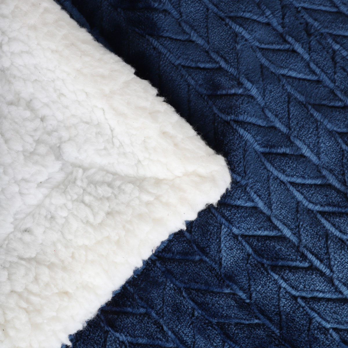 The LARENblanket is reversible. The upper side has a beautiful, deep navy blue shade and a herringbone pattern. The other side is white and has the texture of a soft sheepskin. It is soft and pleasant to the touch. The blanket is 150 cm wide and 200 cm long.