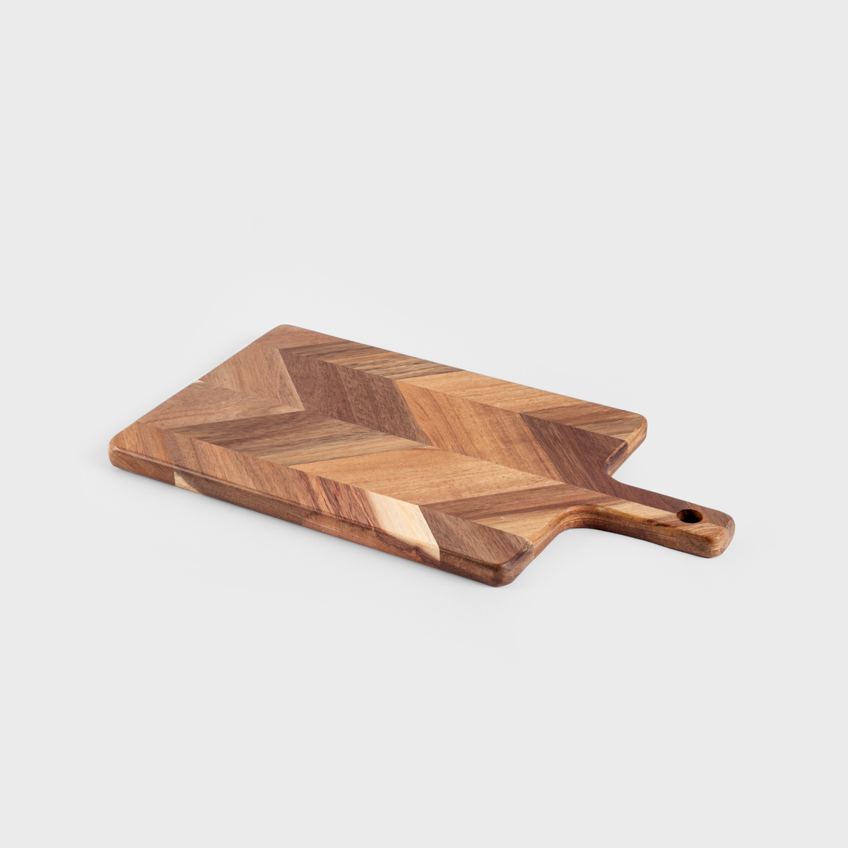 The NEVADO board will enrich any beautifully set table. The unique herringbone pattern, achieved by subtly varying the tones of the wood, gives the board a unique look that is eye-catching and provides the perfect backdrop for cheese, fruit and other delicacies.