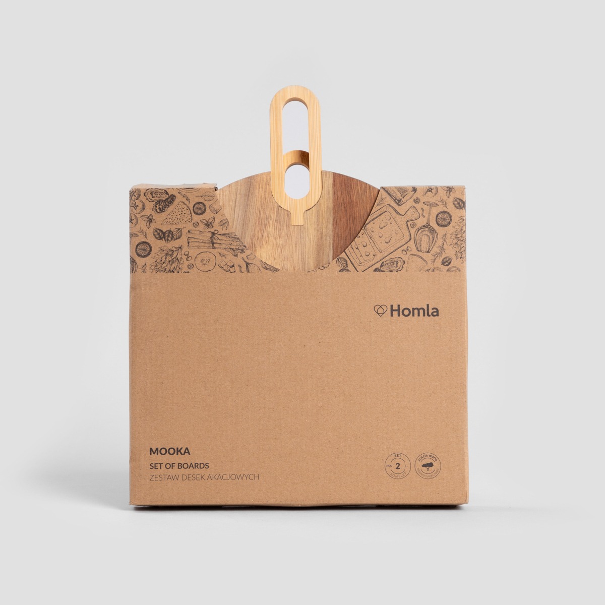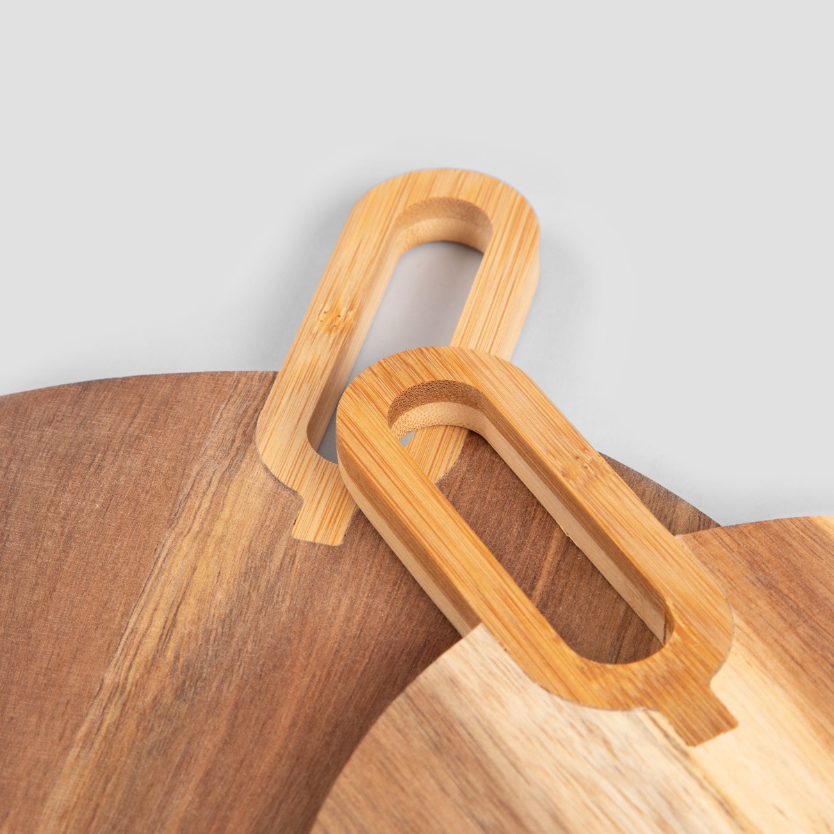 The MOOKA board set is a combination of aesthetics and practicality. Made of durable wood, they are characterized by their natural, warm shade and unique texture. The round shape and comfortable handles make them ideal for both preparing meals and serving them.