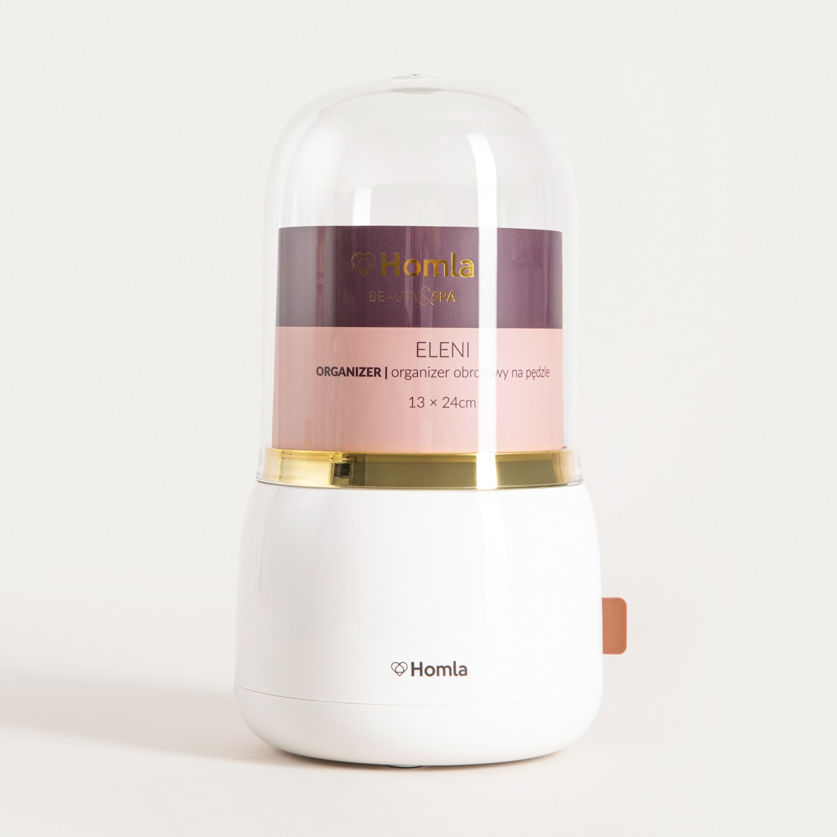 The ELENI organiser is an elegant and convenient solution for storing make-up brushes and other cosmetic accessories. Thanks to its swivel base, it provides quick and convenient access to all products, while the lockable lid protects them from dust and dirt. The stylish white finish combined with gold detailing gives it a luxurious feel that blends perfectly with modern settings.