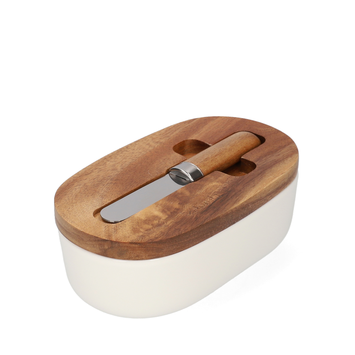 The product was made of porcelain. The bottom part of the butter dish can be washed in the dishwasher. The wooden lid together with the knife is recommended to be washed by hand. Due to the use of natural material (acacia wood), the shade may differ from that shown in the photos.