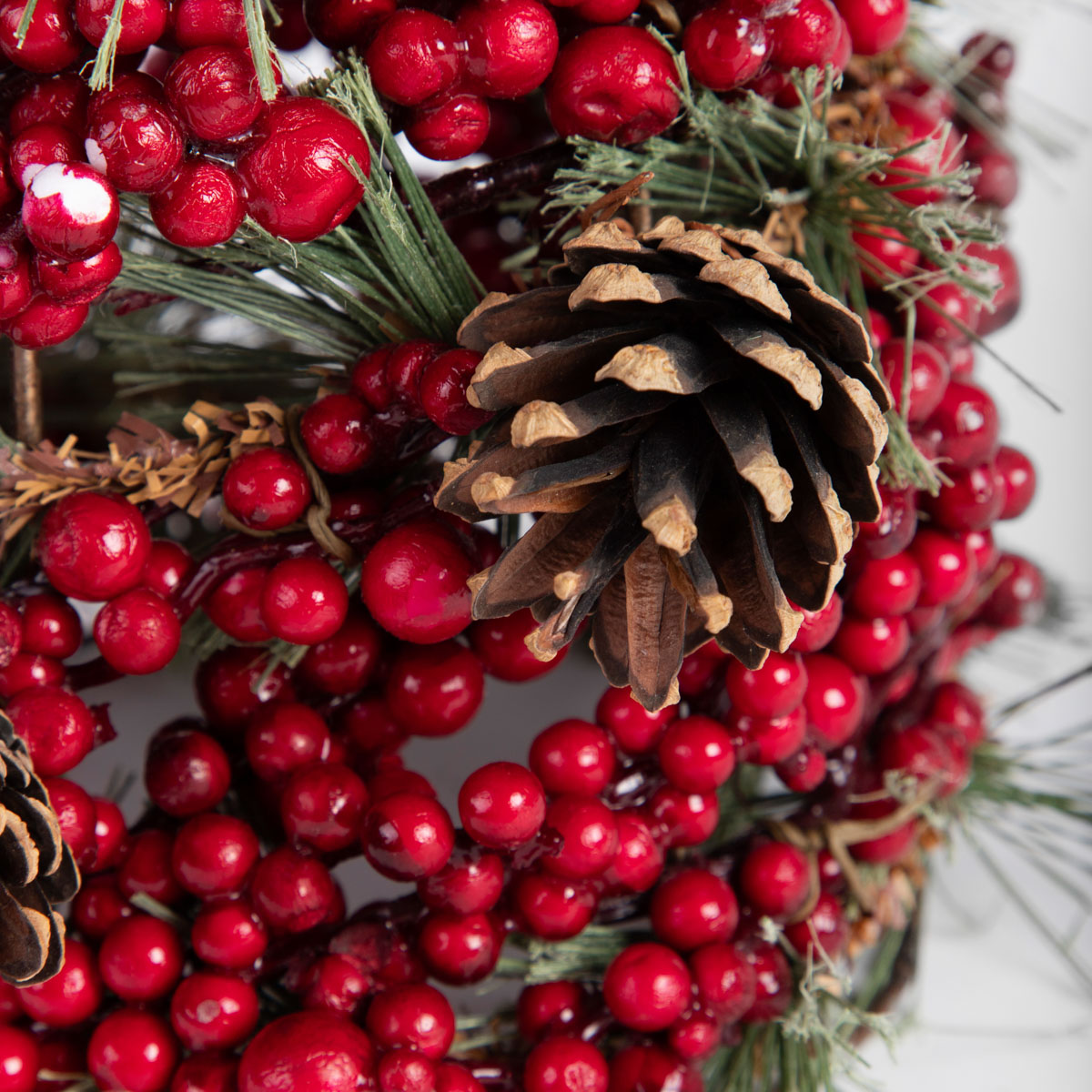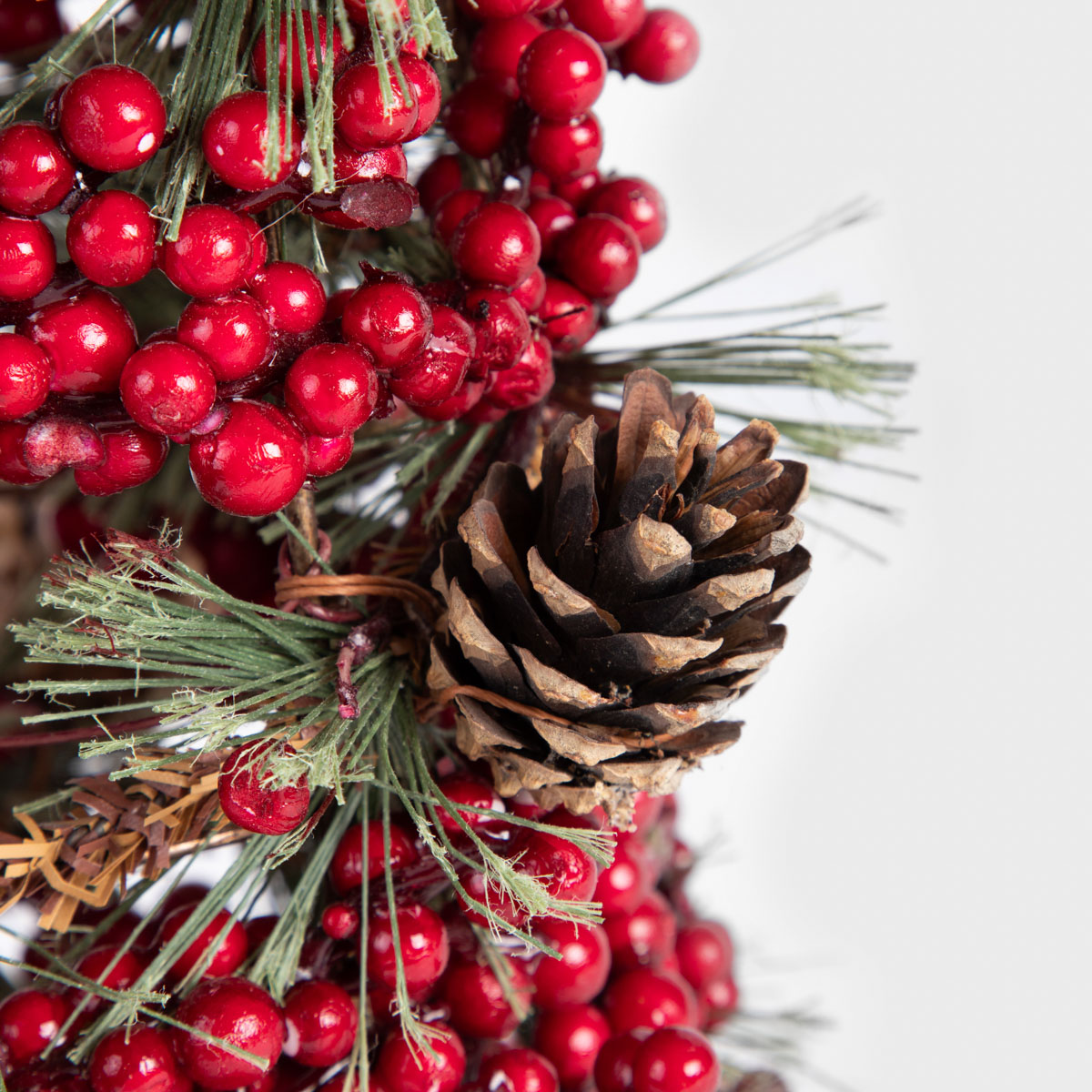 The slender Christmas tree attracts attention with rich decorations in the form of red berries and natural pinecones, which create a beautiful festive composition. The spiralling twigs give it a dynamic look. The pinecones add to its rustic charm, fitting perfectly with the natural Christmas decor.