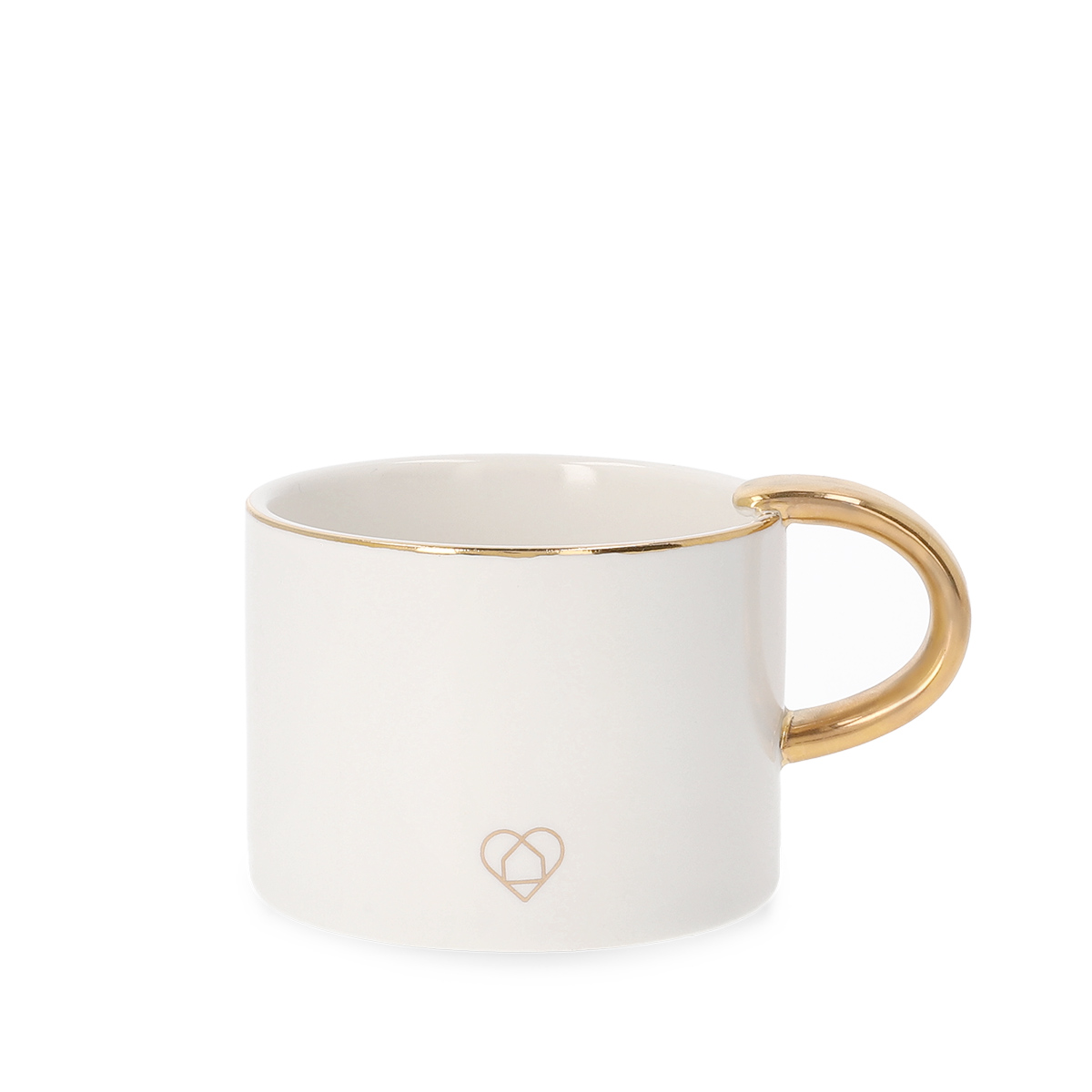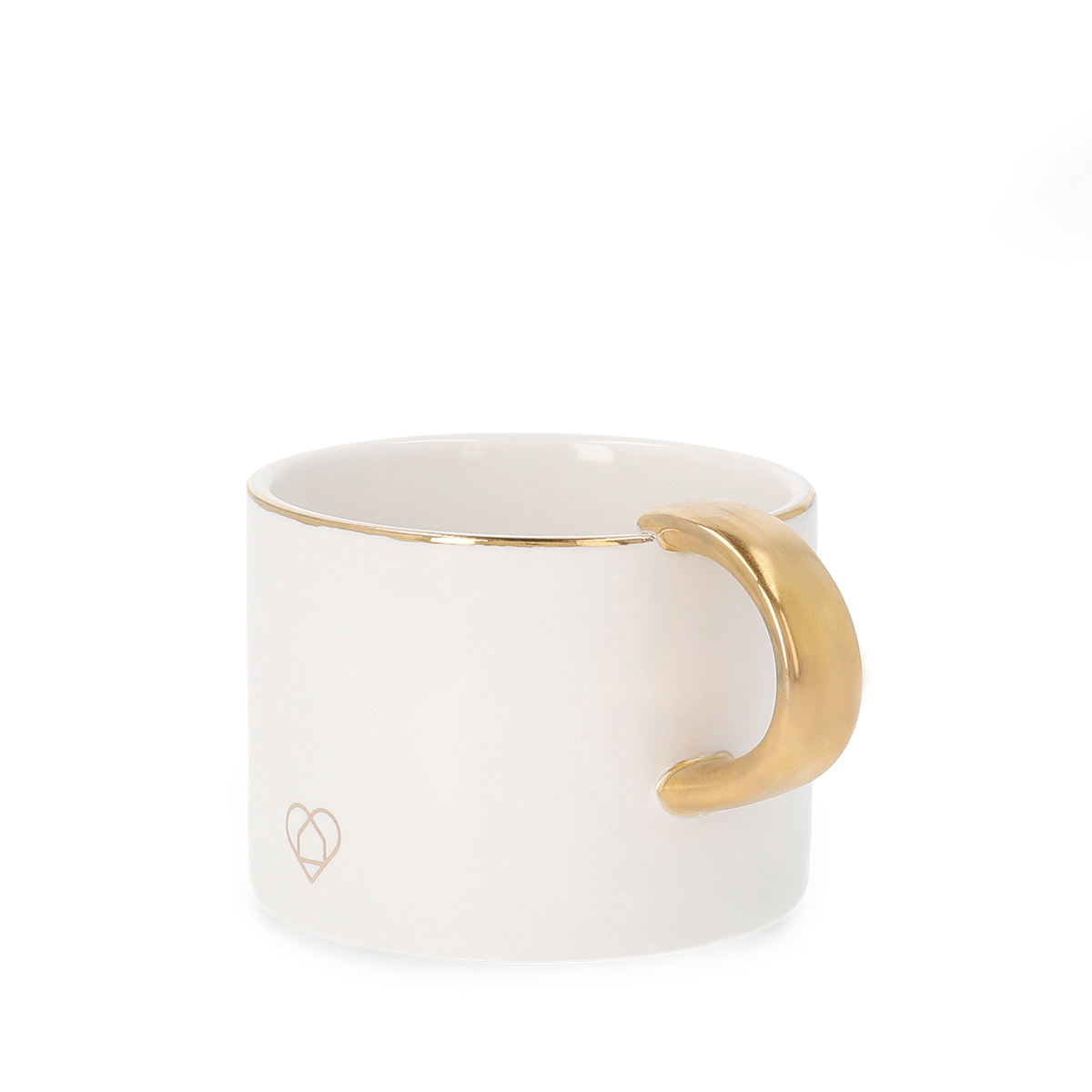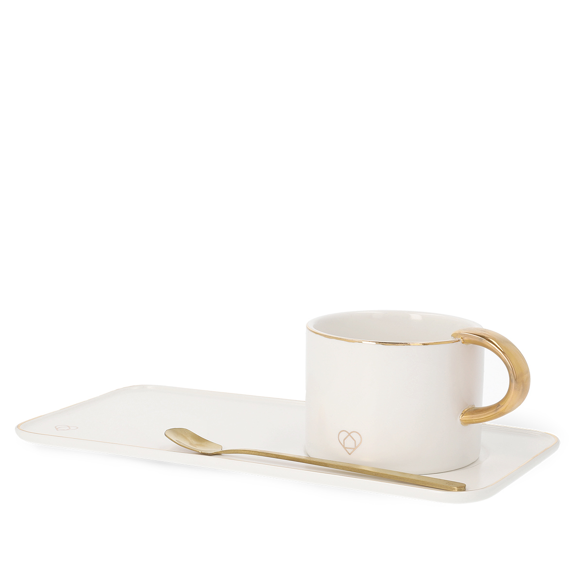 The BOMLO cup has a minimalist design. Its cylindrical shape has been accentuated with white color. The classic white has been decorated with gold accessories in the form of a rim at the top and an ergonomic handle. The saucer also has a gold rim and its size allows the spoon to be set aside or provides a place for dessert. Both the saucer and the cup feature a gold Homel heart. A gold spoon is included in the set.