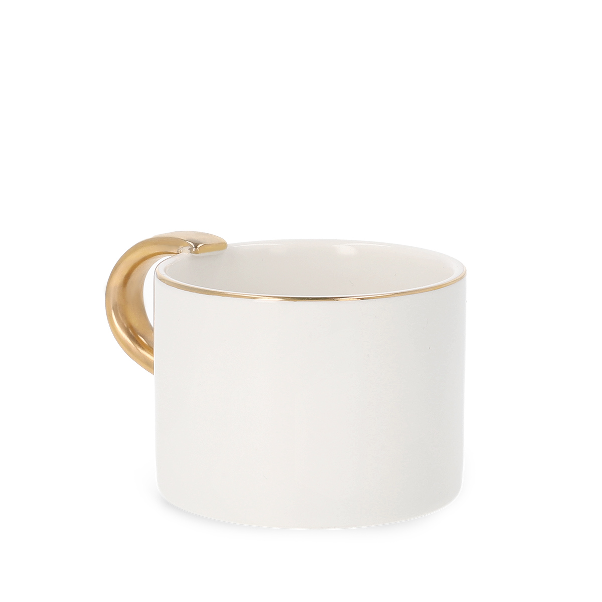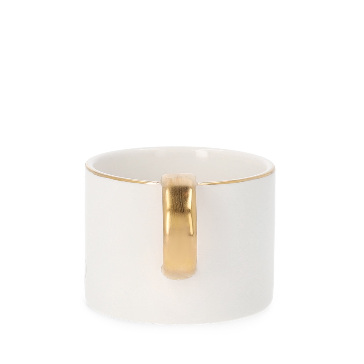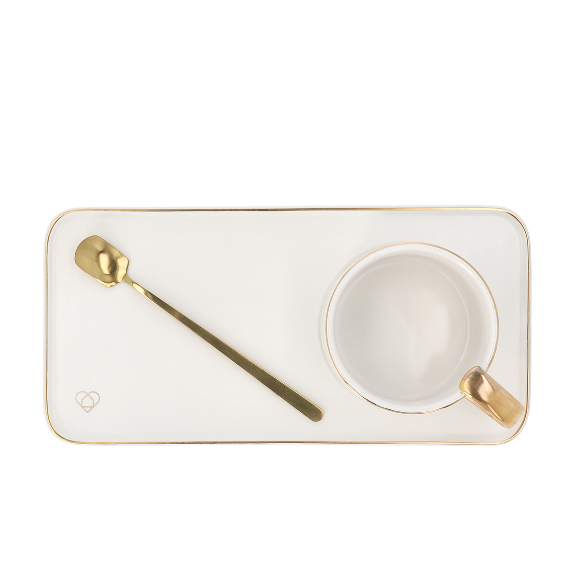 The BOMLO cup has a minimalist design. Its cylindrical shape has been accentuated with white color. The classic white has been decorated with gold accessories in the form of a rim at the top and an ergonomic handle. The saucer also has a gold rim and its size allows the spoon to be set aside or provides a place for dessert. Both the saucer and the cup feature a gold Homel heart. A gold spoon is included in the set.