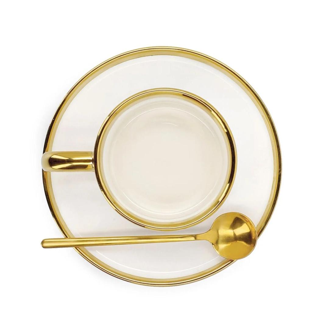 The SINNES cup catches the eye with its streamlined shapes, which are perfectly accentuated by the bright colors. The dominant color is white, which adorns the walls on both the inside and outside. The golden seam of the cup, spoon and saucer subtly accentuate its noble appearance. It has a capacity of 200 ml.Material