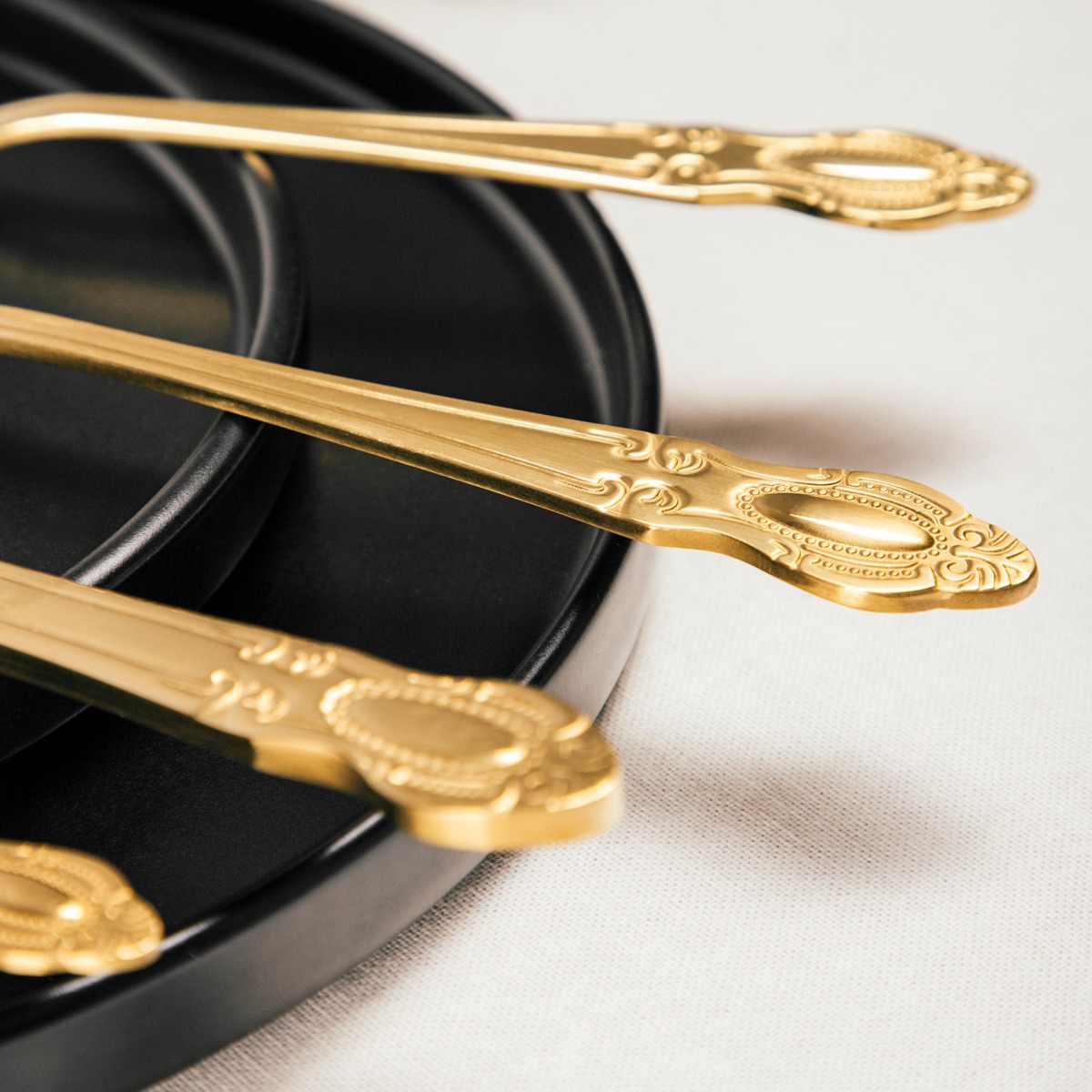 Enhance the charm of your tableware with the elegant gold-colored cutlery. The cutlery has a striking decoration on the handle and a beautiful glossy finish. Their stylish design blends perfectly with both classic and modern table settings.
