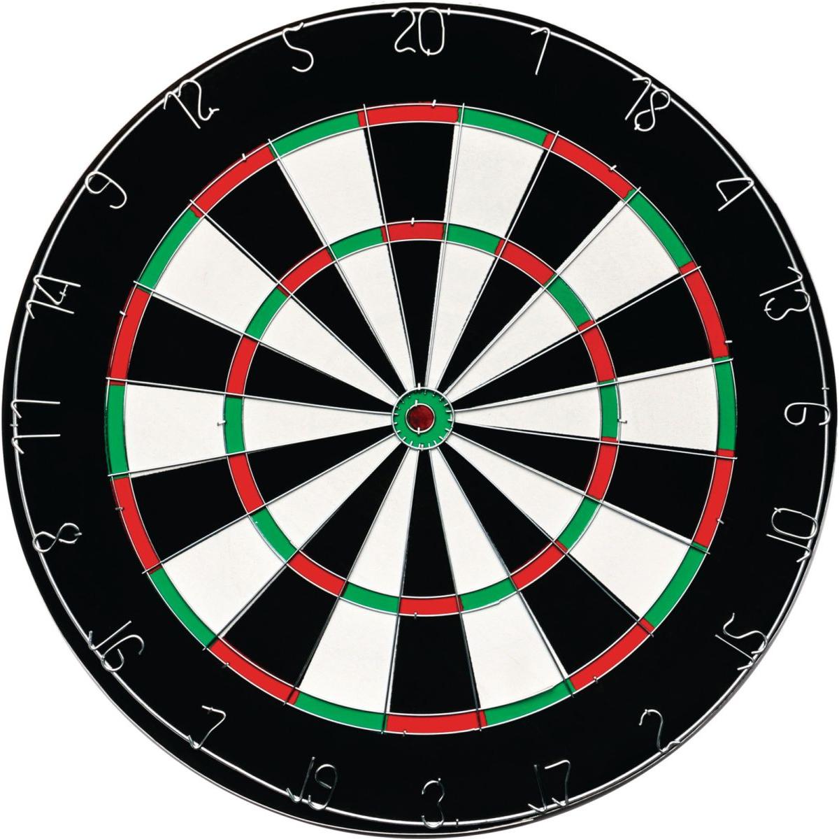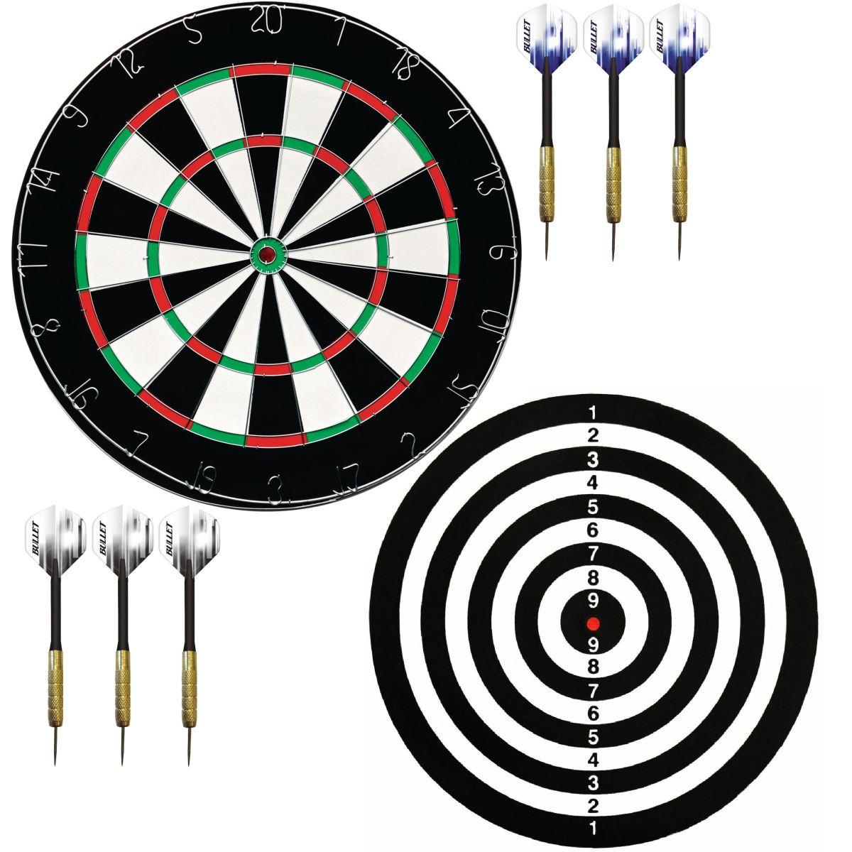 • : double-sided target, 6 brass-plated steel barrel darts, 6 250 micron darts in two colors (black and white and navy blue)