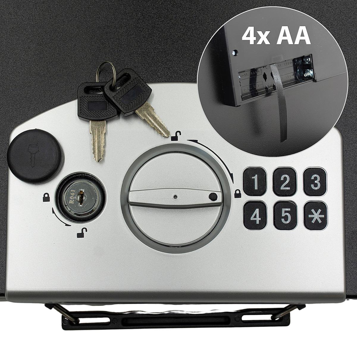 The safe is equipped with an electronic combination lock that allows you to set an individual PIN code, providing quick and convenient access to the contents. The lock runs on batteries, and in case of battery depletion, access can be gained with an emergency key, guaranteeing security even in emergency situations.