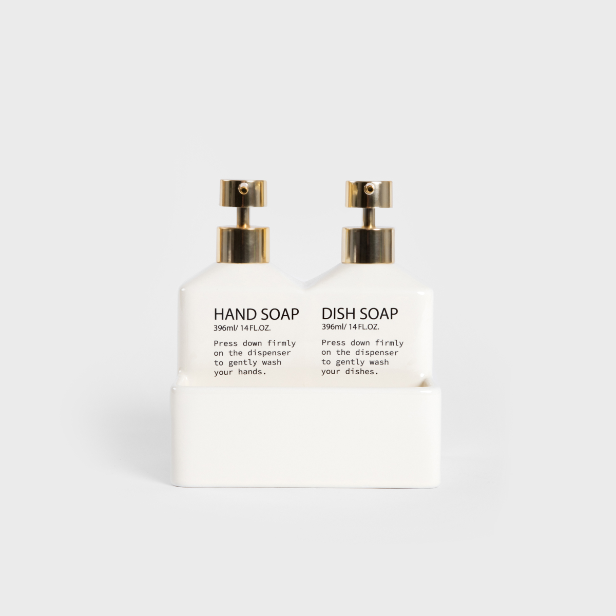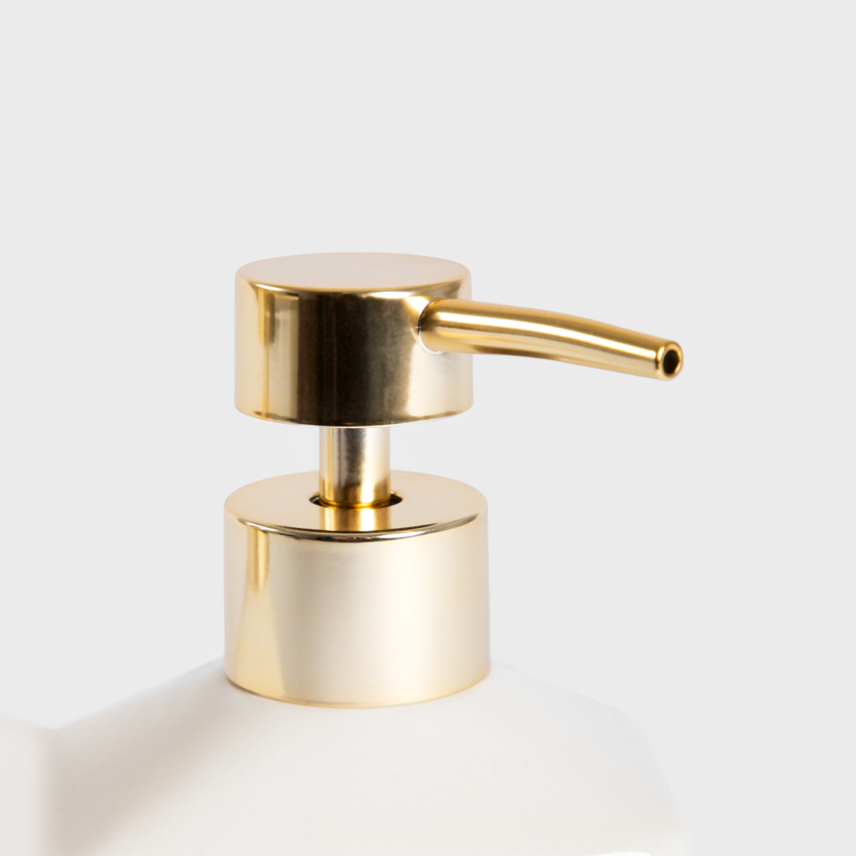 The EBRO dispenser is a combination of style and functionality that is perfect for any kitchen or bathroom. The cream color juxtaposed with the gold pumps creates a harmonious and elegant whole. Its modern design fits perfectly into a variety of design styles, from minimalist to classic.