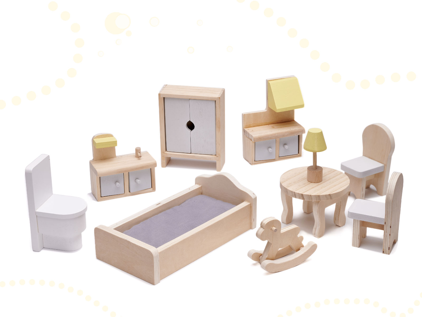 Furniture (10 pieces): 2 chairs, table, lamp, bed, rocking horse, closet, cabinet with sink, stove, toilet