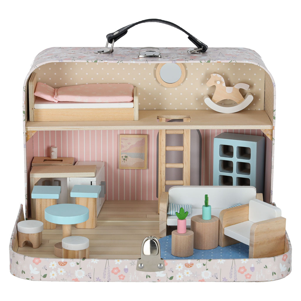 Miniature doll house in the form of a suitcase hides charming furniture made of fabric and wood. Soft pastel colors combined with natural wood give the interior an atmosphere of coziness. The house can accommodate small dolls and figurines – empathizing with the adventures of the toys develops empathy and emotional intelligence.