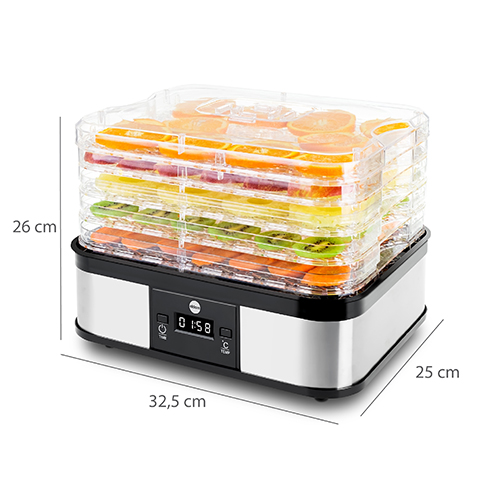 The dryer has five sieves measuring 30 x 23 cm , the height of which can be adjusted . This is a very useful solution when drying larger products.