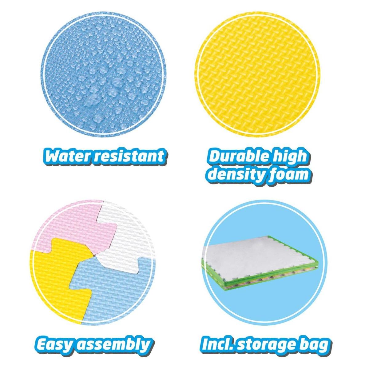 The foam puzzle is stress-resistant and has non-slip properties, ideal for play, yoga, fitness, Pilates, or aerobics.