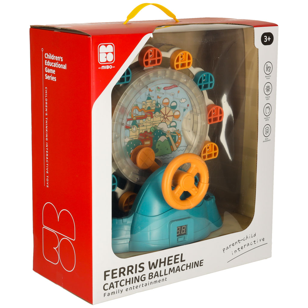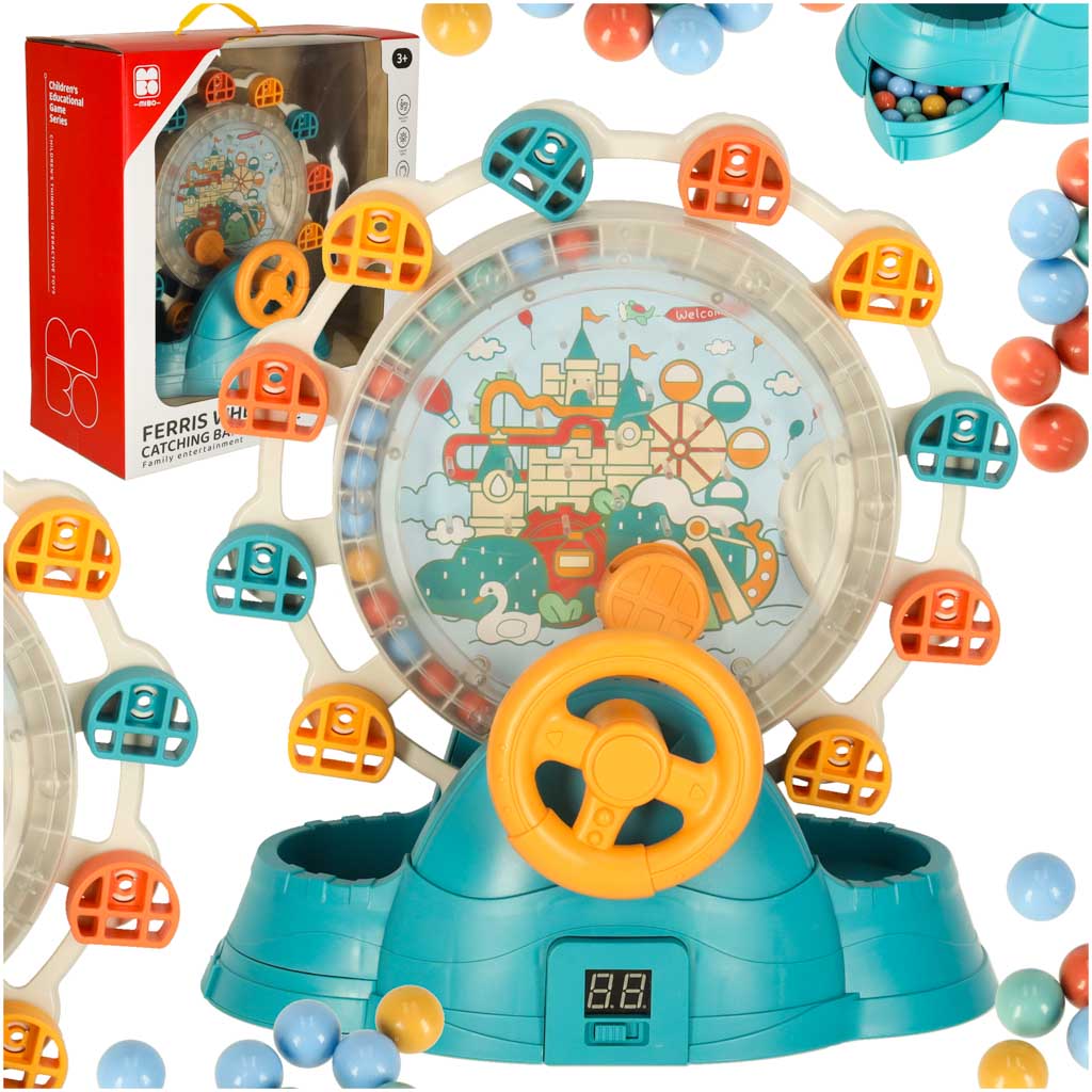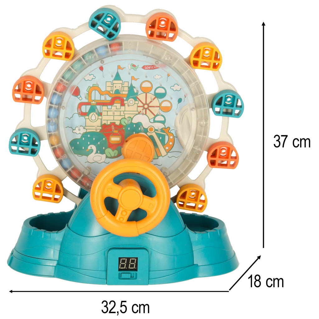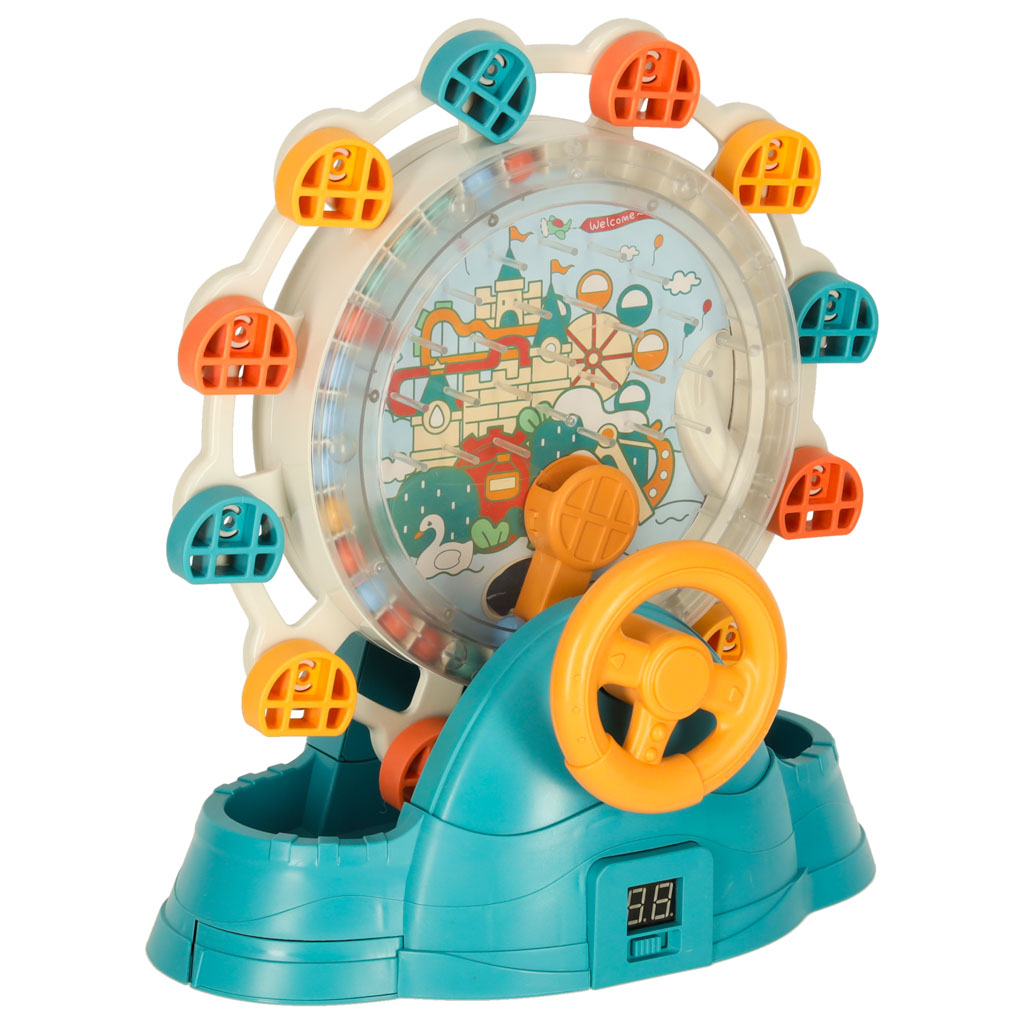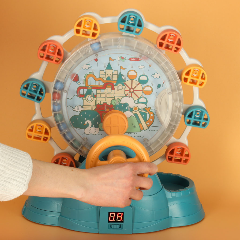 ● Colorful mechanism with rotating Ferris wheel, ball container, controllable steering wheel and ball catching trough