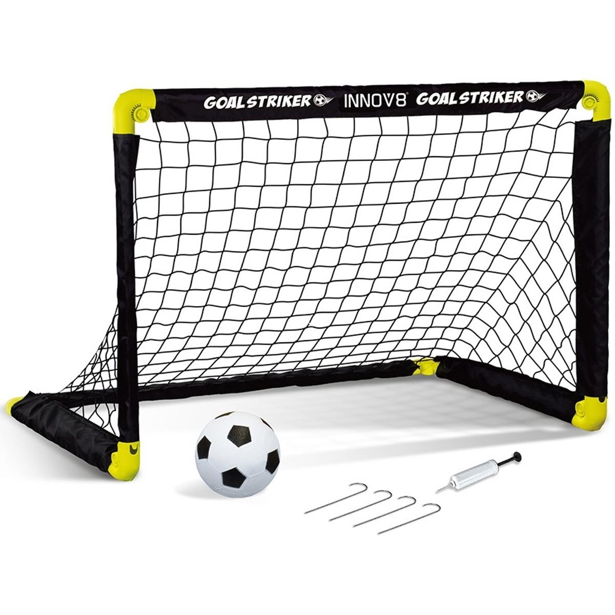 The goal comes with an inflatable ball and a pump, so after unpacking, seating the goal with the pegs and inflating the ball, your child can start playing.