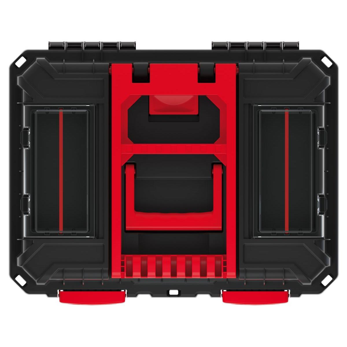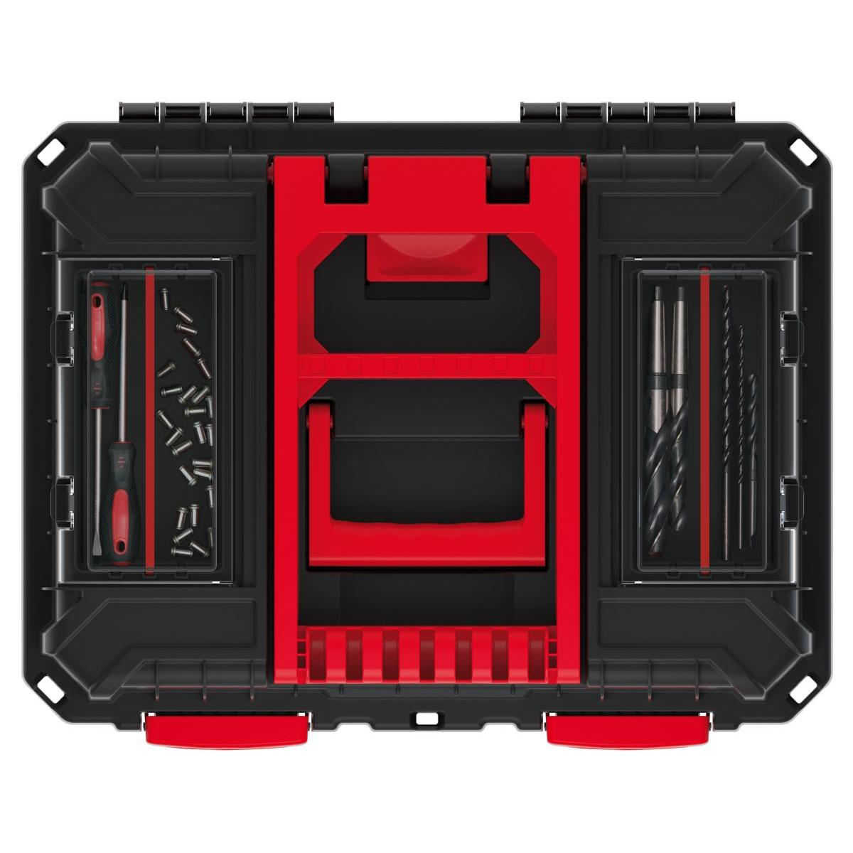 It is very practical, with a deep tool carrier, and special organizers equipped with removable dividers and cups have been built into the lids for easy storage of small items. The lids of the organizers are transparent, made of durable polycarbonate.