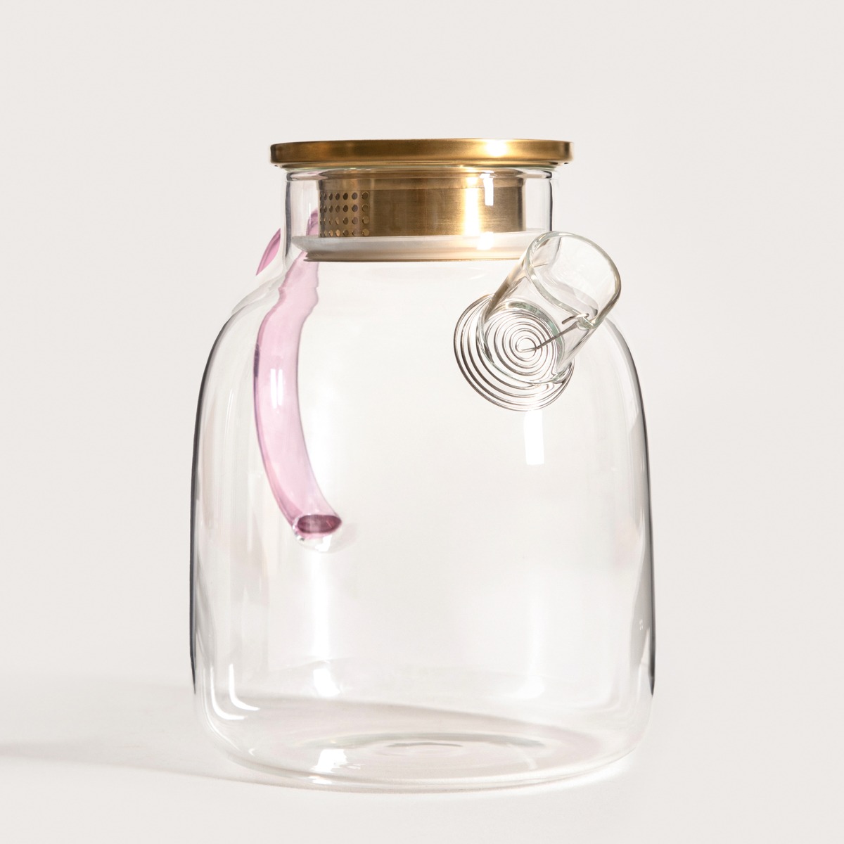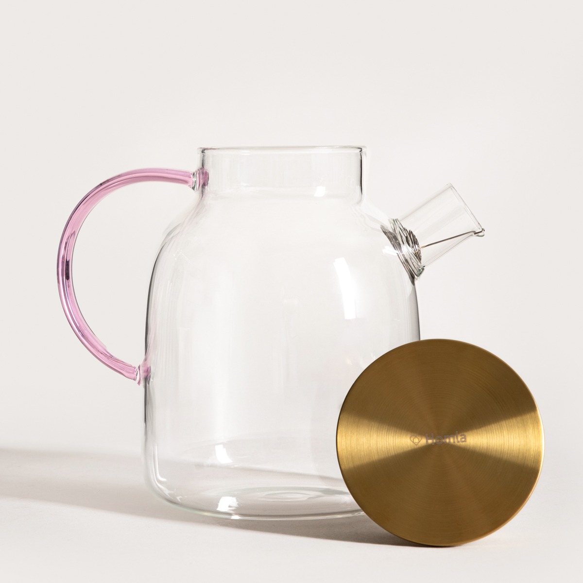 Looking for a larger jug that combines elegance and convenience? The KUBBE pitcher with a capacity of 1.8 liters is the ideal choice. It will be perfect for serving water, juices, compote or hot tea. The subtle pink handle and golden lid add a touch of style, while the robust glass combined with stainless steel ensures durability and comfort. Thanks to its elegant design, the jug not only makes it easy to serve drinks, but also becomes a table decoration.