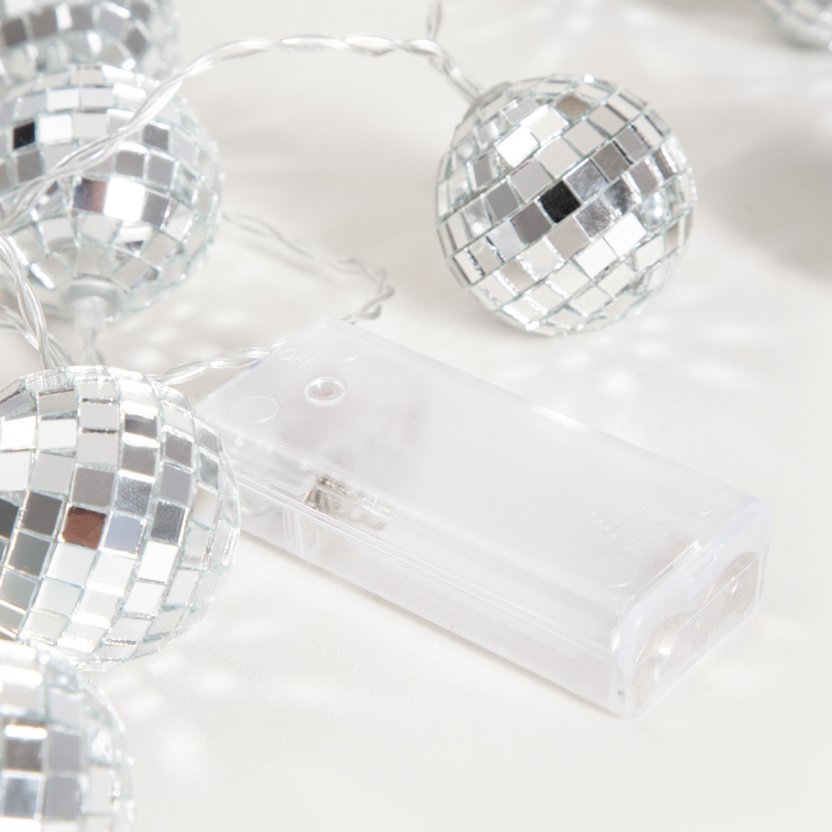 DISCO lights are strung on a cable connected to a battery tray, equipped with an on/off switch. This makes them convenient to use, simply hanging them in the desired location, and they do not require access to a mains socket. They are great for window decorations, hanging on a curtain rod or suspended from a ceiling lamp. They are also a versatile all-season decoration for a teenager’s room.