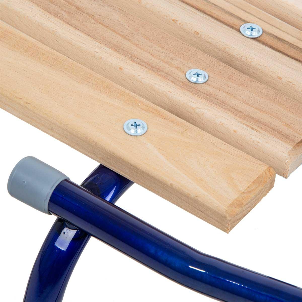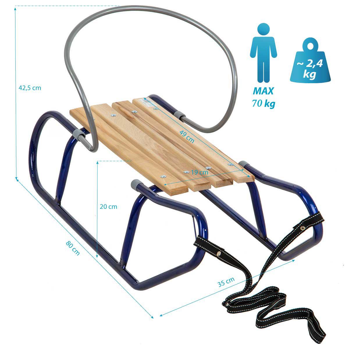 Steel and solidly bolted skids and wooden parts protected with the appropriate impregnation will give you the feeling of a very well made decision to buy them. Very easily removable backrest you can take off at any time, so your happy and curious toddler will be happy to use them for a long time. Equipped additionally with a long thick pull strap, which will make it easier to walk or pull the sled up the hill.