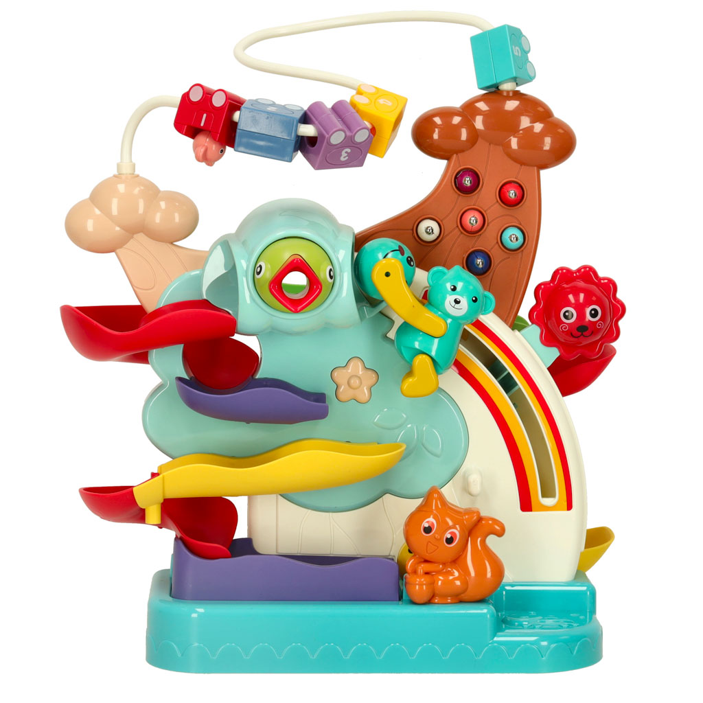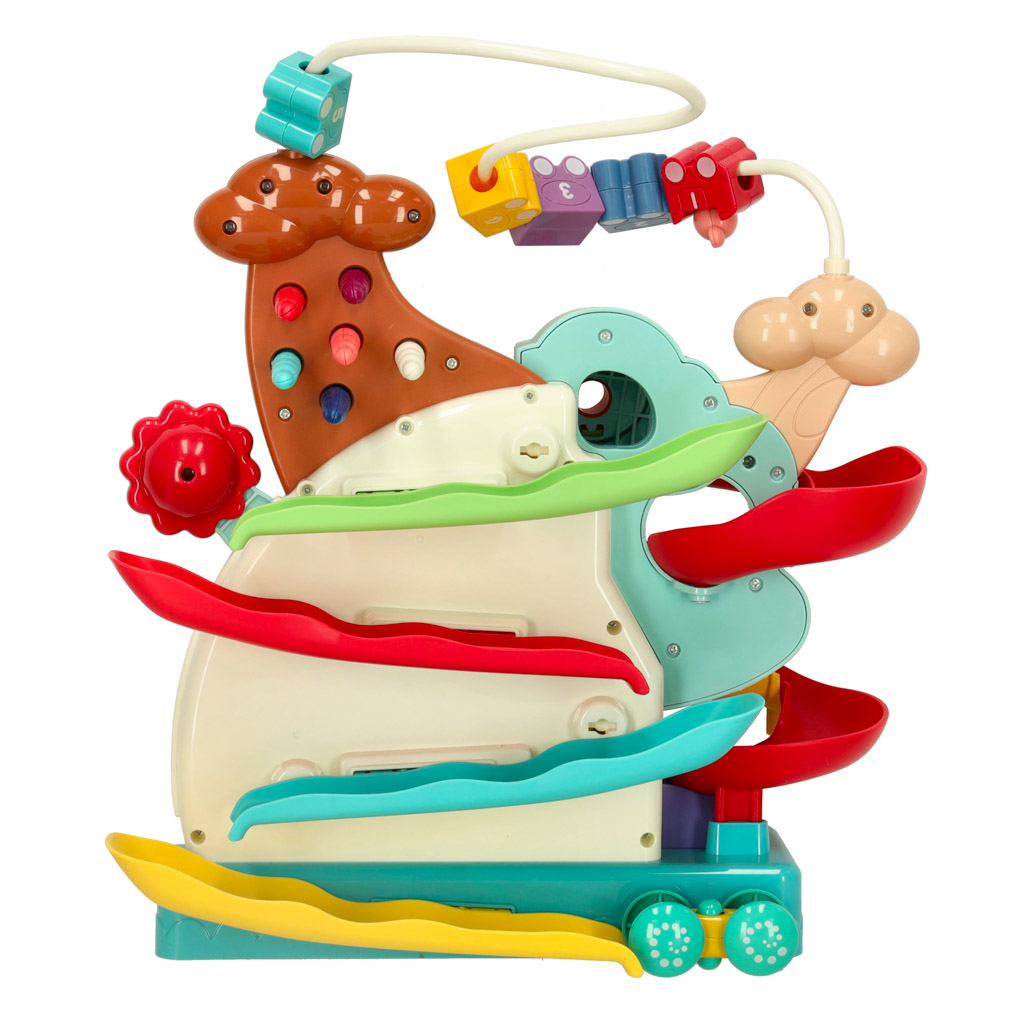 The toy has not one, but as many as two tracks, on which colorful balls or a car can roll. An additional attraction is the colorful wagons with numbers, which the child can move and rotate. It also has a “feed the bird” game, which involves collecting worms and feeding them to a bird.