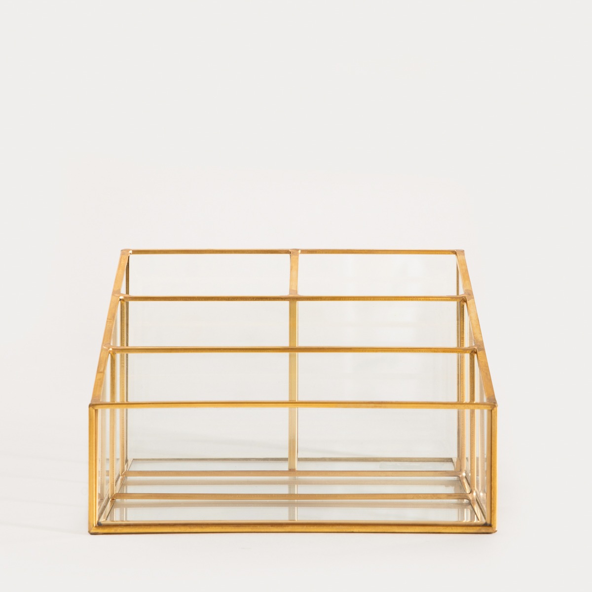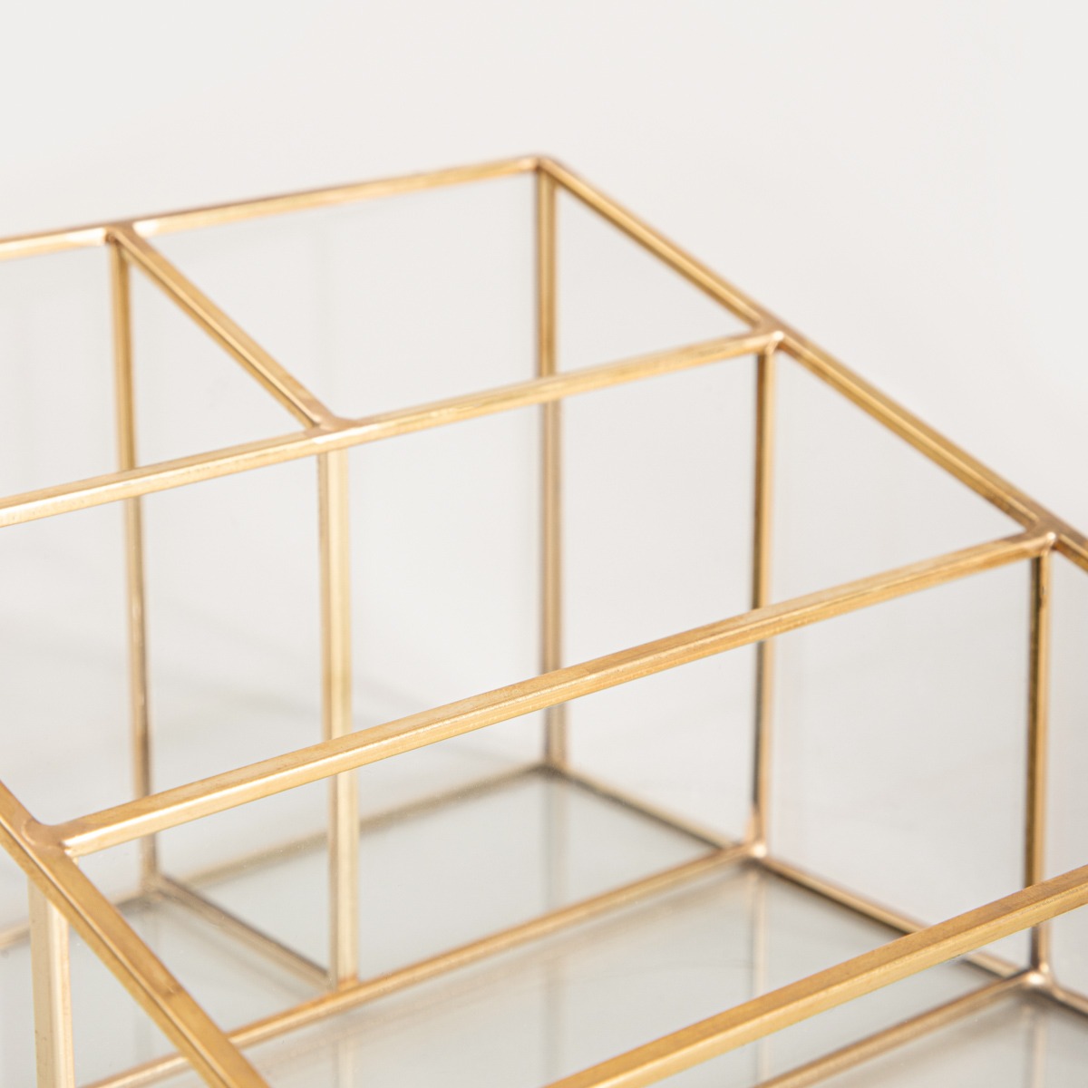 Looking for an elegant and practical organiser for your interior? The GRAZIA organiser will be an excellent option. The combination of glass and gold metal gives it a luxurious feel that goes well with both modern and classic interiors. Thanks to its compact dimensions, it can be placed on a desk, dressing table or shelf, keeping your home tidy.