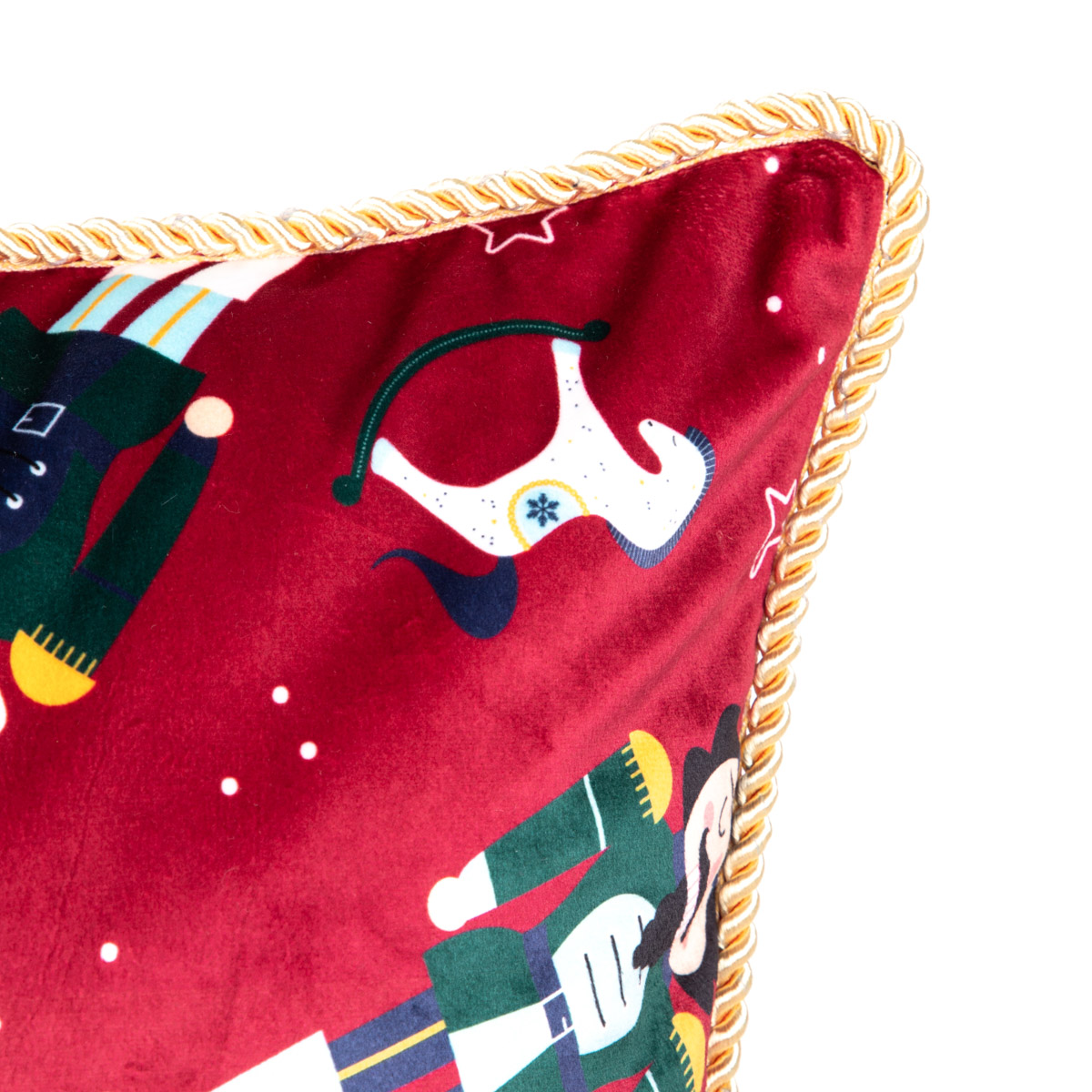 The AITONA cushion cover is double-sided – the back side is plain and the front side is decorated with a Christmas pattern. The whole cushion has a beautiful red color. The pattern consists of a composition of nutcrackers, rocking horses and stars. The pillowcase is 45 cm wide and 45 cm long. It fastens with a zip placed on the side. It is trimmed all around with beige piping in the form of a decorative, spirally twisted cord.