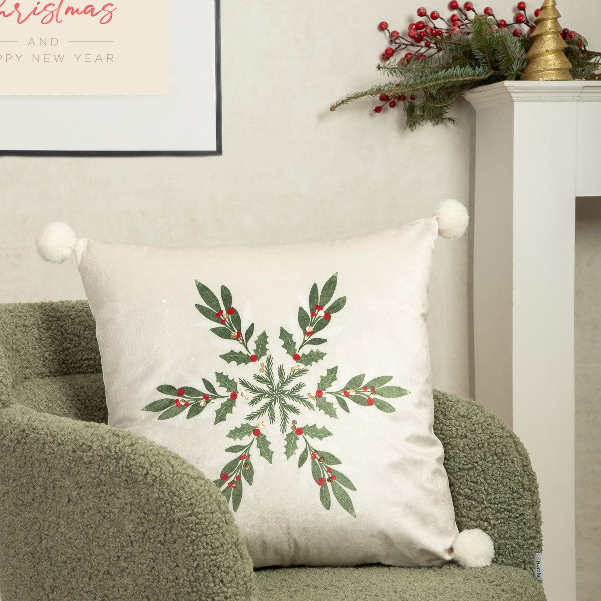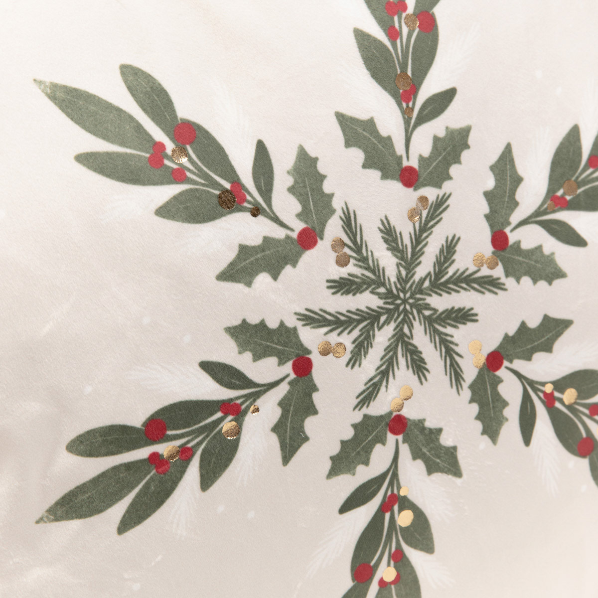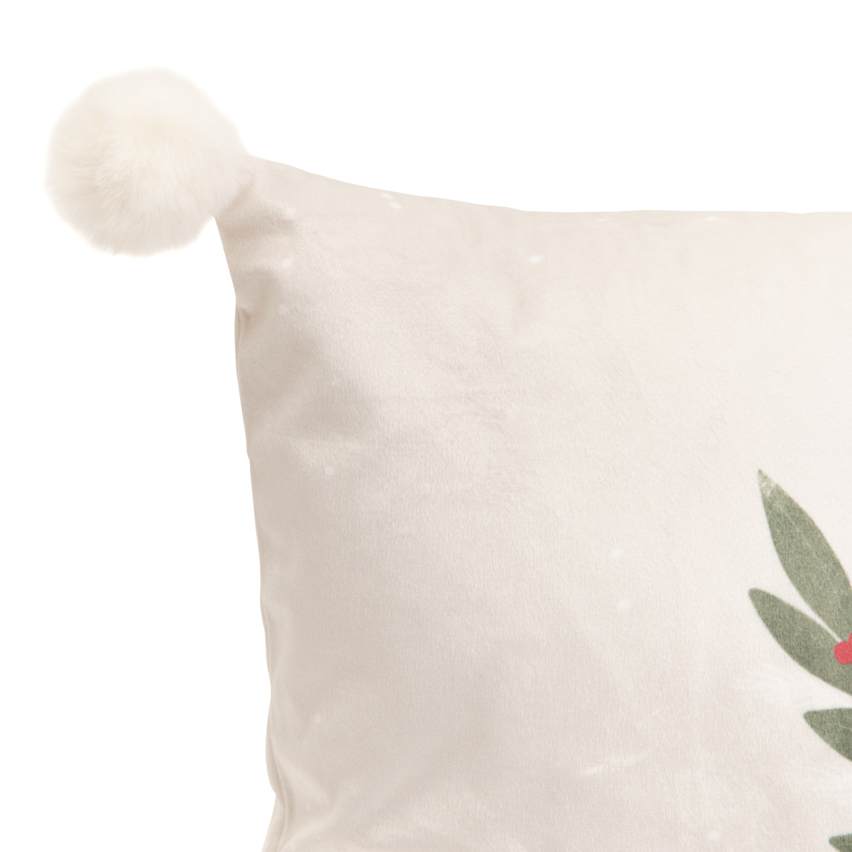 The GALOS pillowcase has been designed in a minimalist style. The pillowcase has been kept in a beige color. The centerpiece features a sprig of mistletoe in a muted shade of green with red fruits. In addition, the pillowcase is decorated with pompoms located in the four corners.