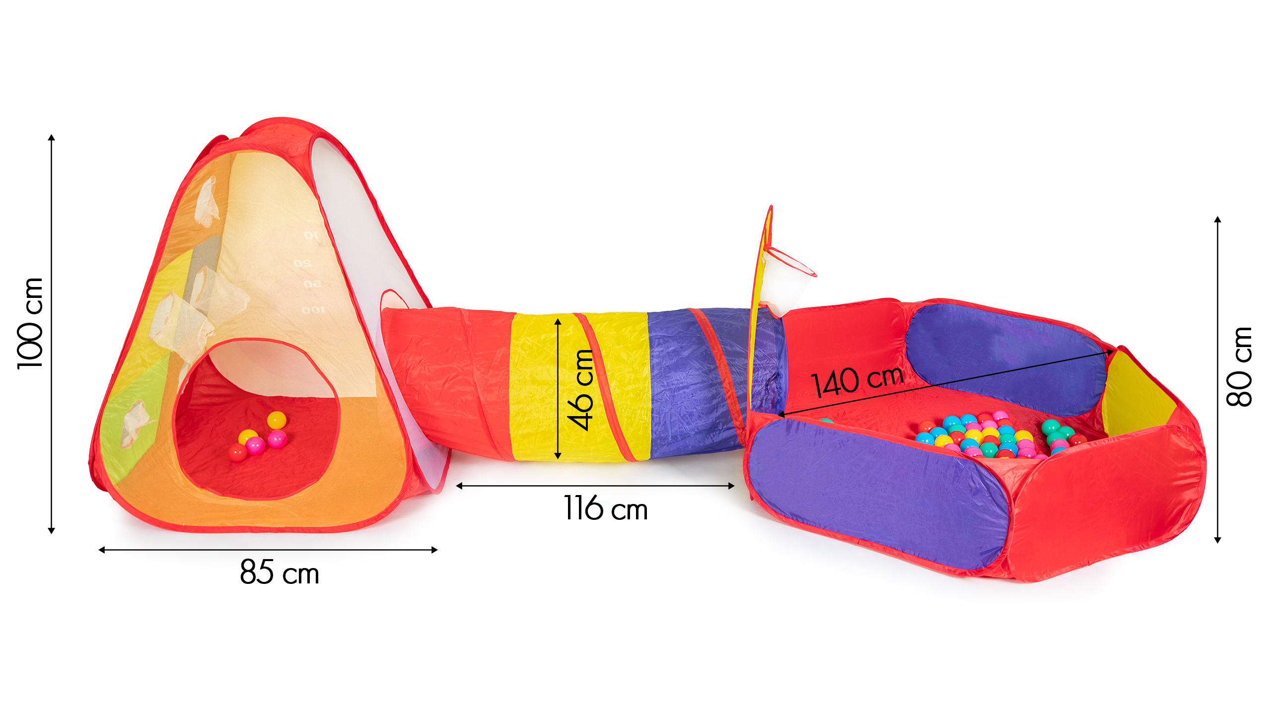 The games tent allows you to play for many hours. The set includes 100 colourful balls which can be thrown to 5 colourful targets on the side wall. The tent is connected by a tunnel with a pool where you can practise throwing at the basket.