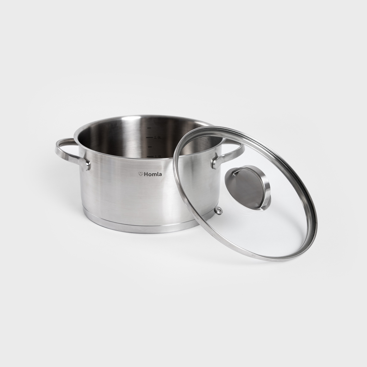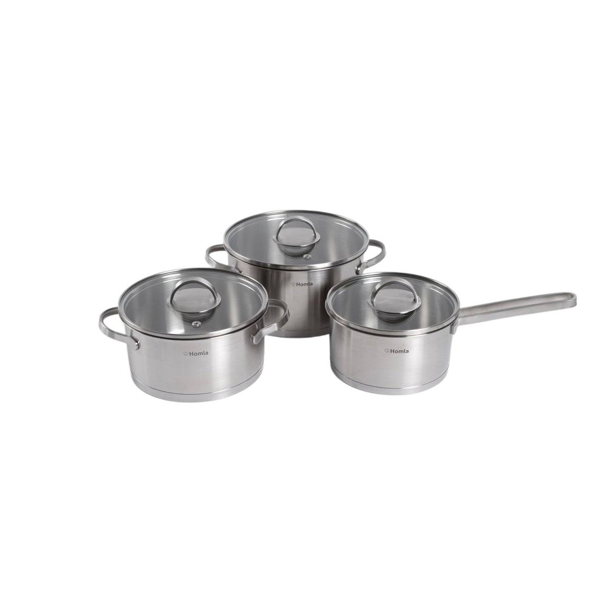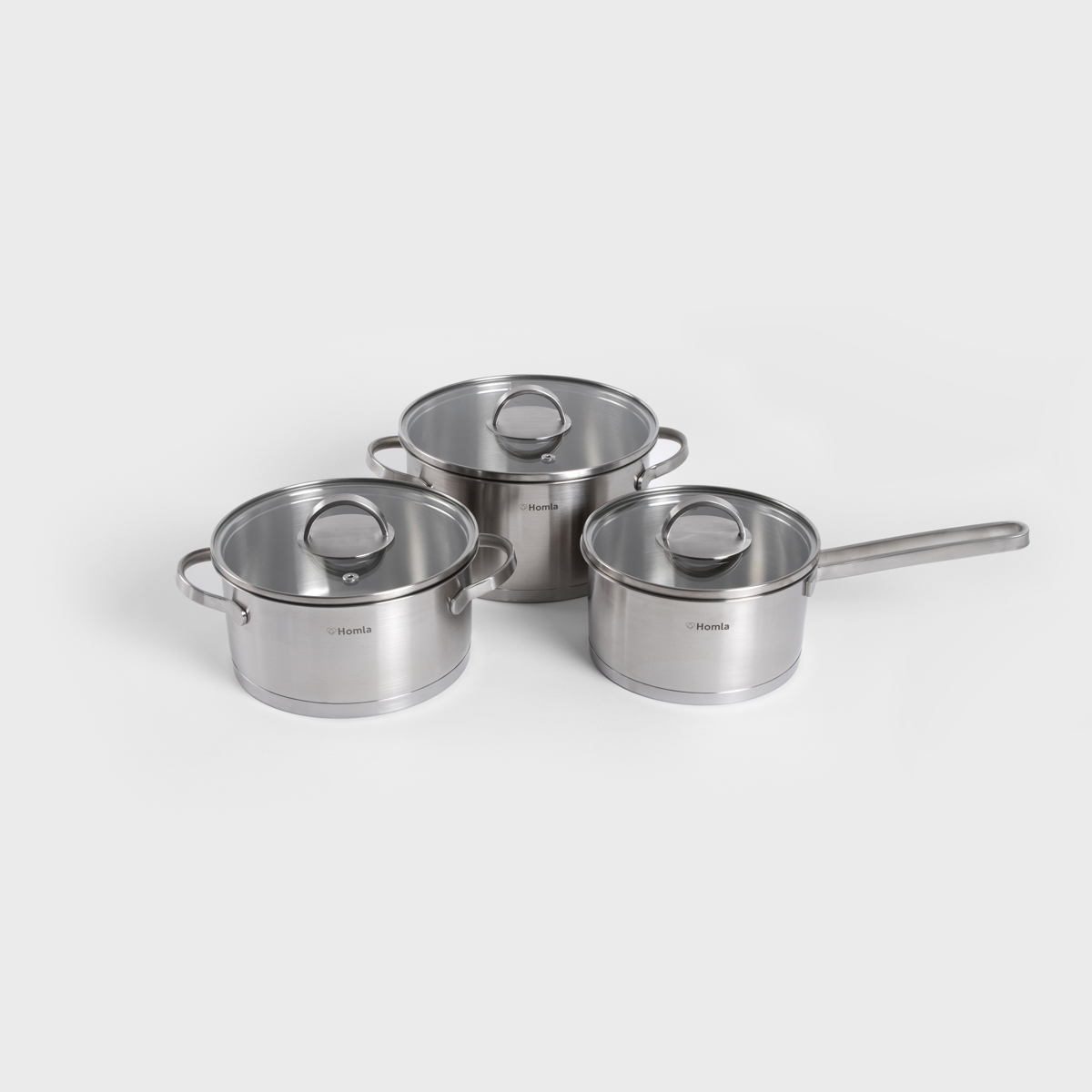 - Set of 6 pieces: 2 pots, saucepan, 3 lids