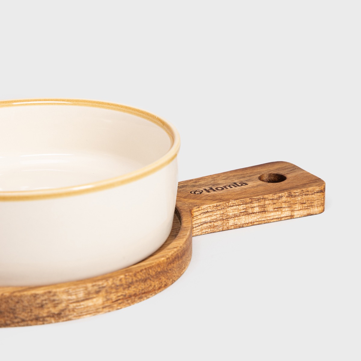Create a stylish setting for your snacks with the ASTRA serving set. It includes three ceramic bowls of varying capacities, placed on an oblong wooden tray. Such a set not only presents the served delicacies in an impressive way, but also makes it easier to serve them.