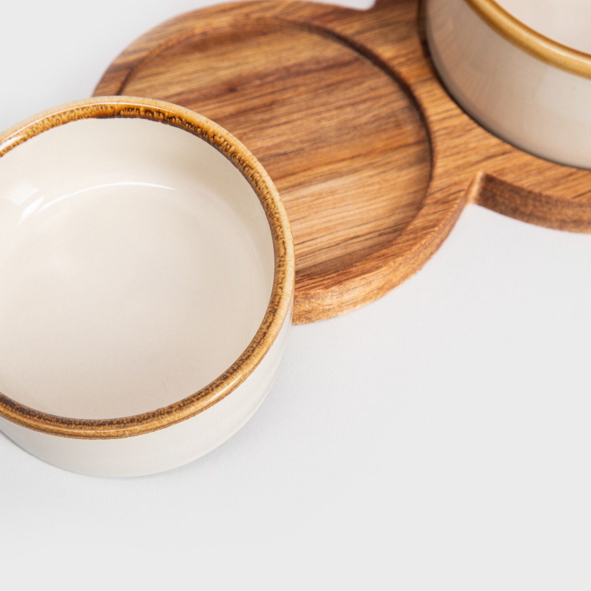 The bowls are made of high-quality, cream-colored ceramic, and the base is made of durable wood, which is easy to clean and safe in contact with food.