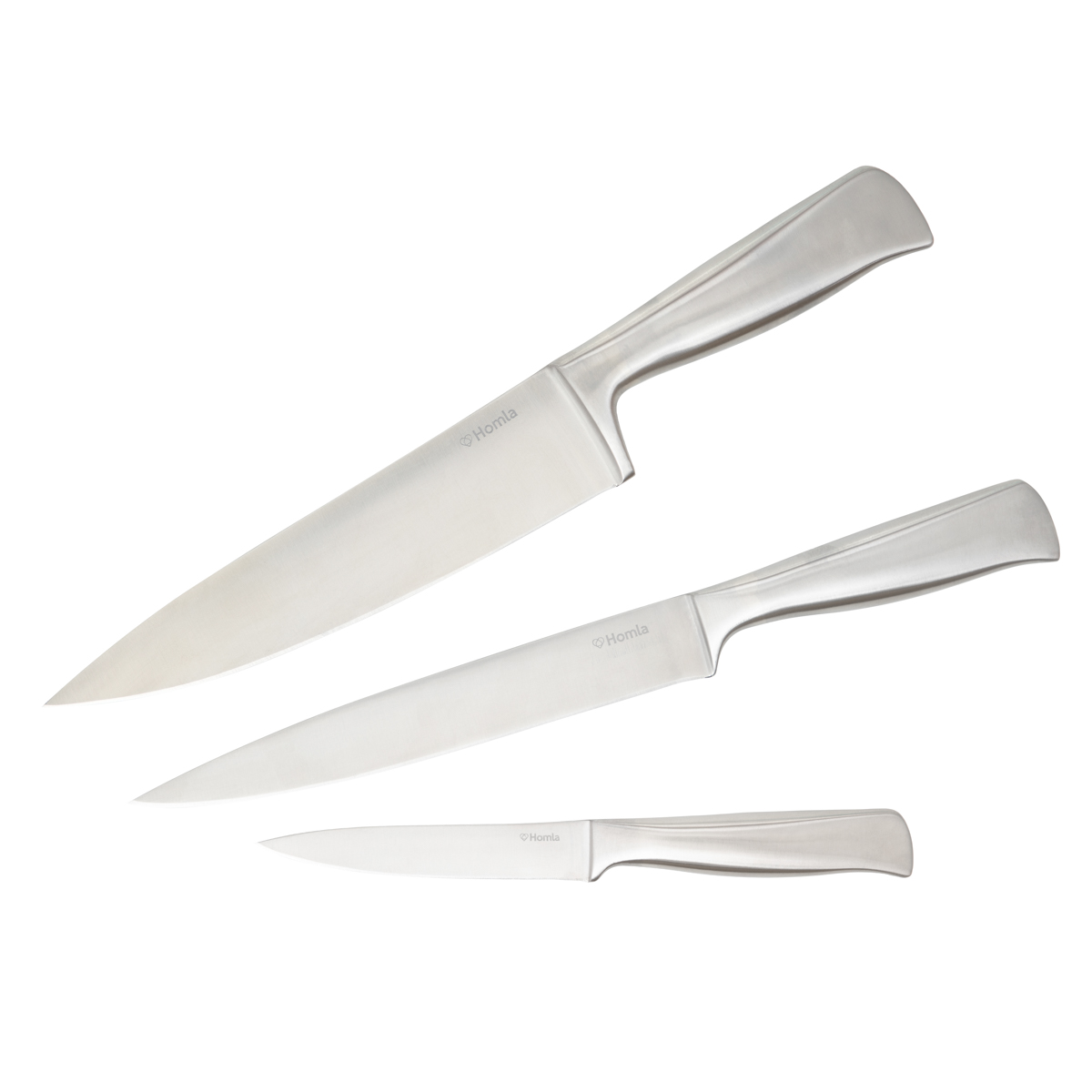 Sharp knives are the absolute basis of kitchen equipment. It is hard to imagine preparing any meal without them. Free action while cooking will enable you to use the RIGEL knife set. It includes three blades of different sizes, each ending in a metal handle. Thanks to the ergonomic shape of the handle and the right balance, the knives lie well in the hand while cutting, which makes them comfortable to use.