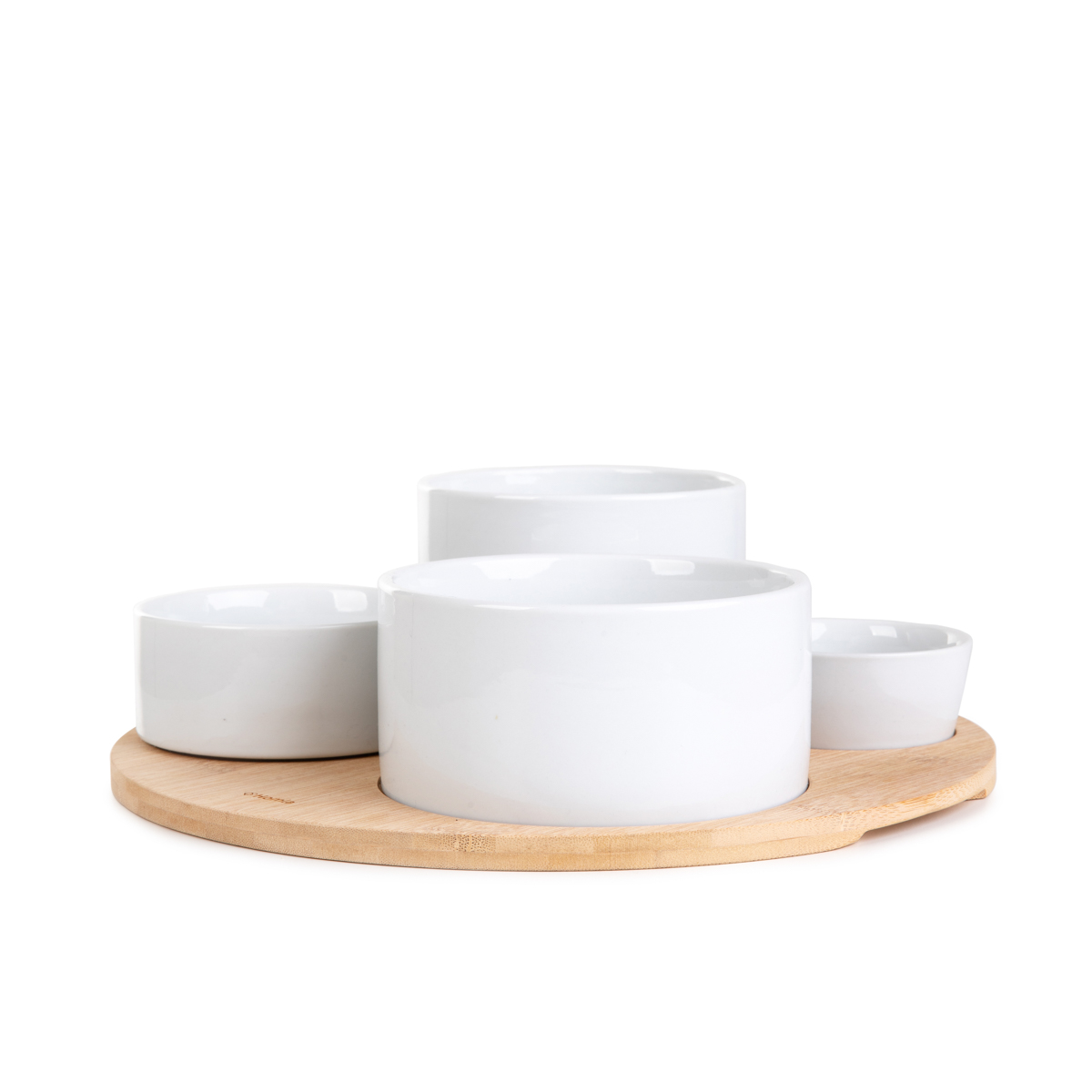 TheHOMLAYIFAN serving set will make even the simplest snacks enchant your guests. It is perfect for an unannounced visit from friends when you only have olives, nuts and crackers in the cupboards, as well as for elegant parties and family gatherings. The set consists of 4 different sized bowls and a bamboo stand with indentations to give the bowls stability. The combination of white and natural wood color makes the set look great on a table, kitchen island or coffee table.