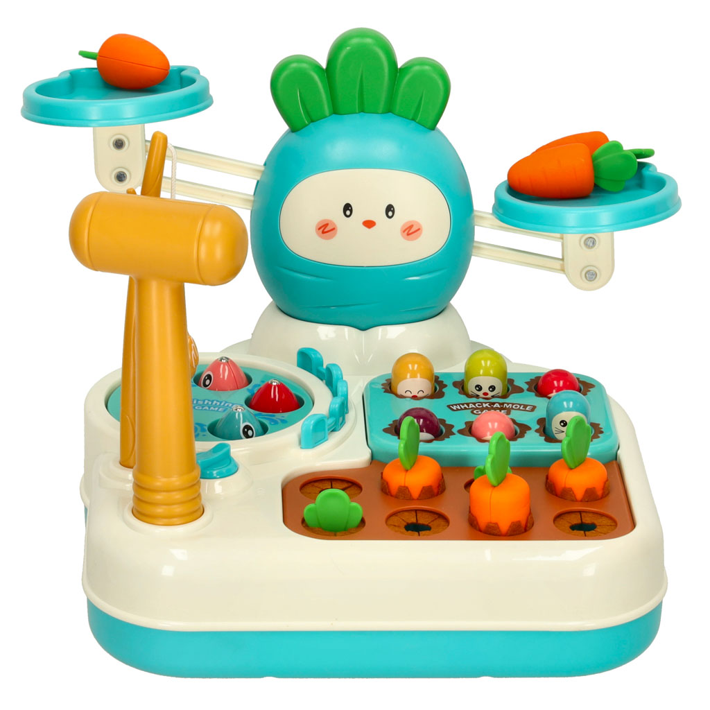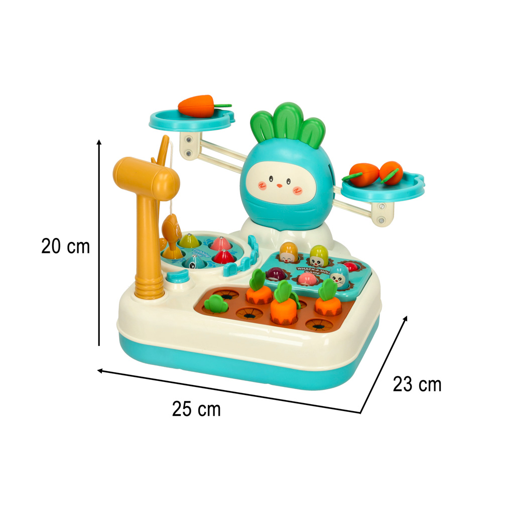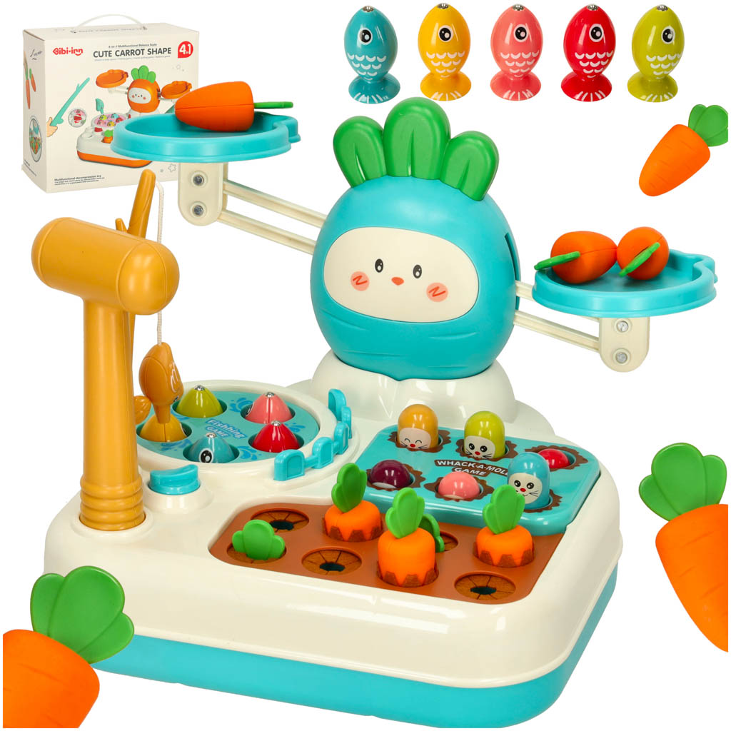 This colorful set combines up to four fascinating games that develop a child’s imagination and manual skills. Thanks to the hammer, fishing rod and other accessories, your child will be able to play fishing, hitting the mole, collecting carrots and balancing the scales.