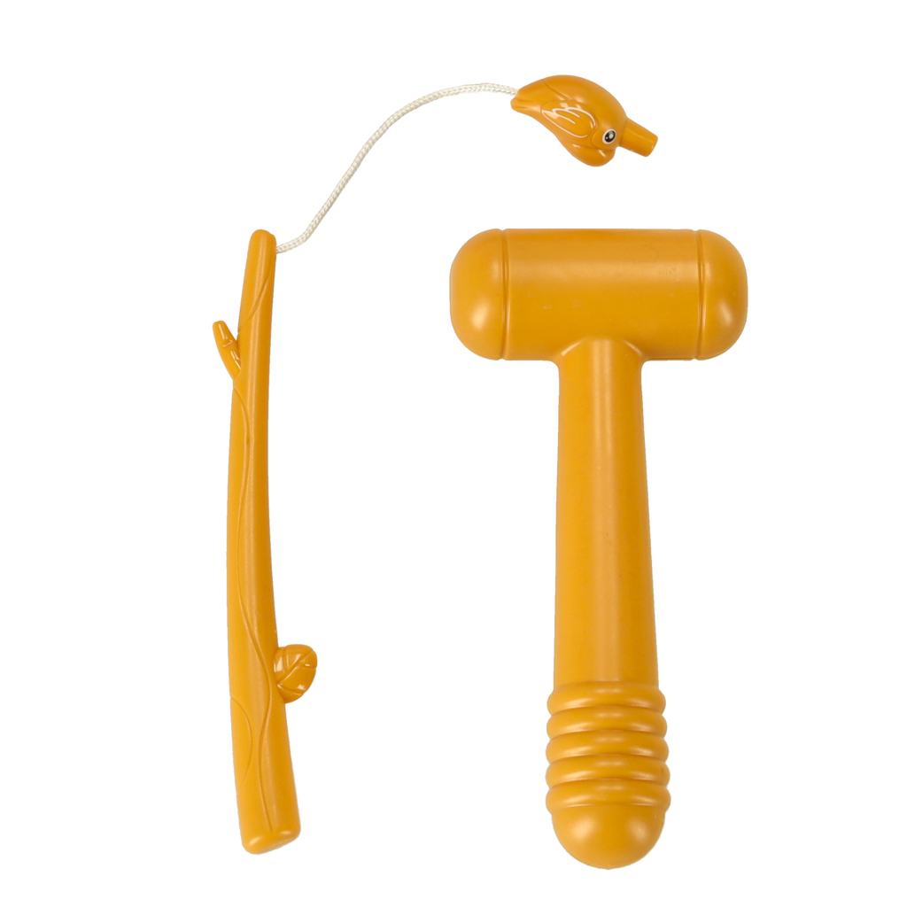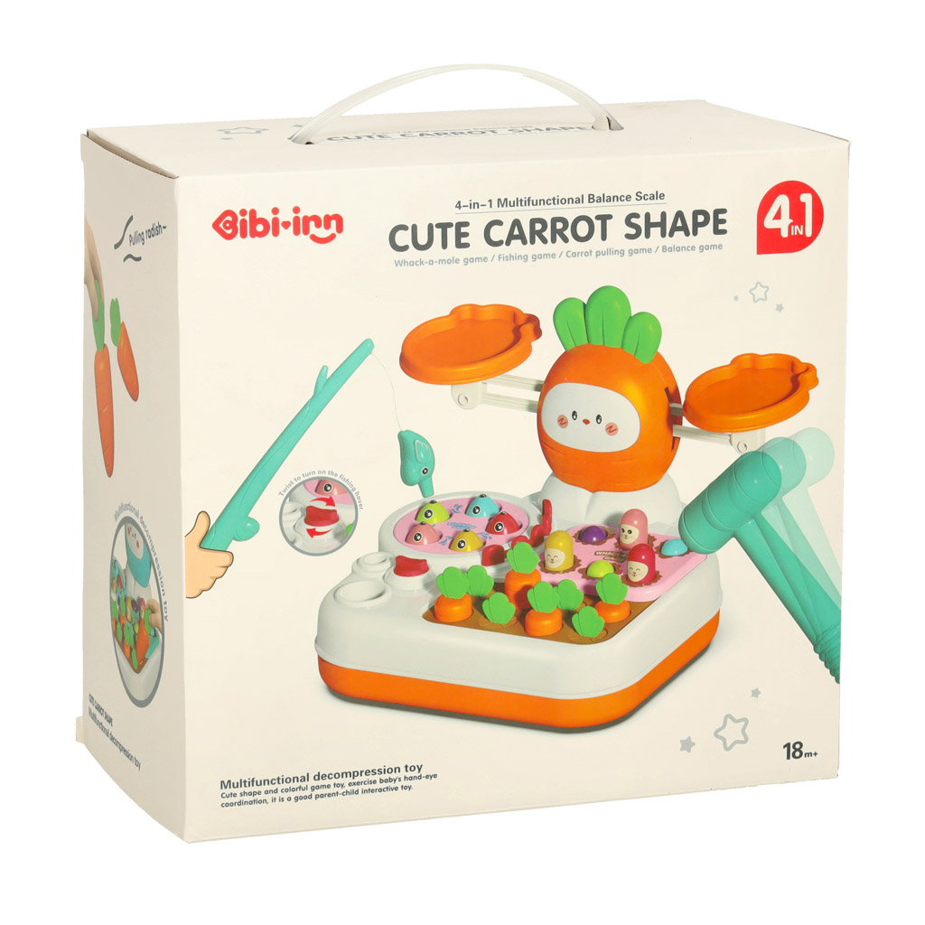 The set consists of a base on which all the pieces are placed. On the large carrot scale the toddler will learn the concept of balance and will be able to compare the weight of different objects. Five colorful fish are waiting to be caught with the fishing rod. Eight carrots will be perfect for both collecting and weighing. And a plastic hammer allows you to hit the popping moles.