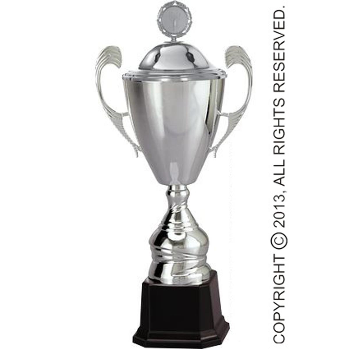 Tall goblet in shiny silver color, with wide cup with comfortable ears and lid.