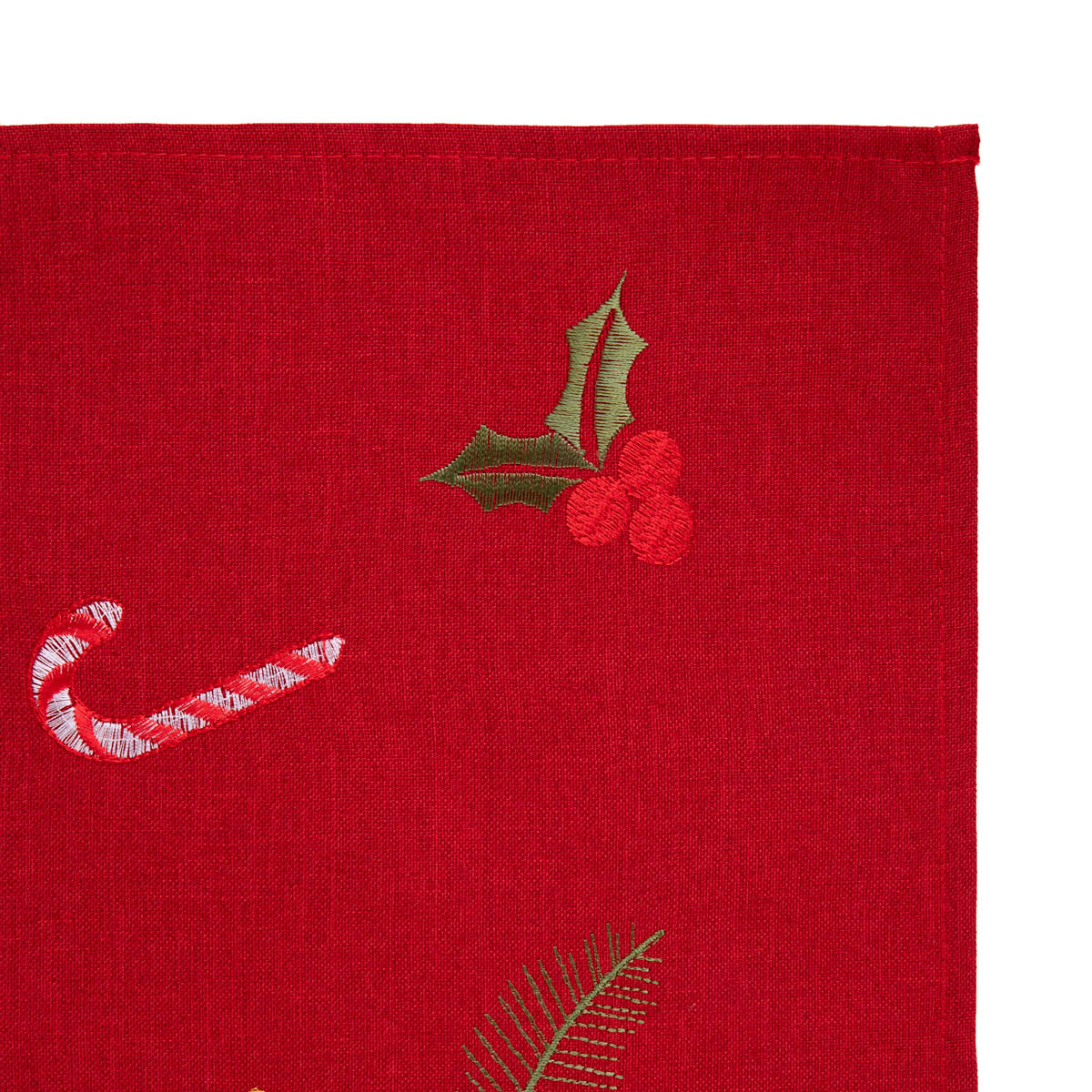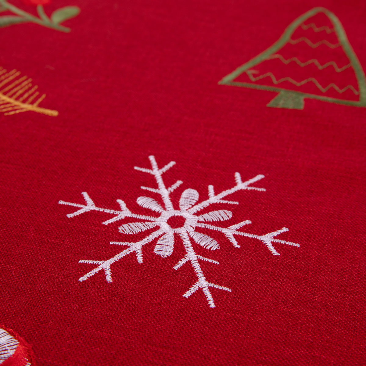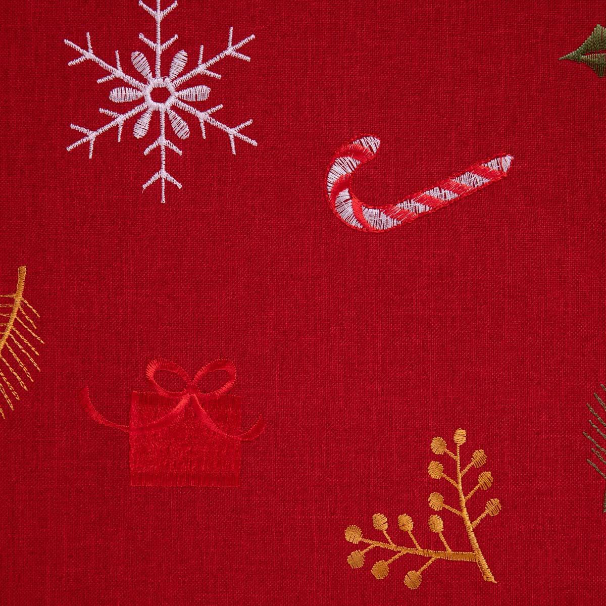 The HOMLA STOM runner is a wonderful table decoration during the magical Christmas season. Made of durable, lightweight material with carefully hemmed edges, it will delight you with its quality and aesthetics. The red background is decorated with embroidered patterns that depict festive symbols, i.e. a Christmas tree, snowflakes and a candy cane, among others. Spread out on the table, it will wonderfully enliven its composition, bringing a cheerful touch to the arrangement of the entire room.