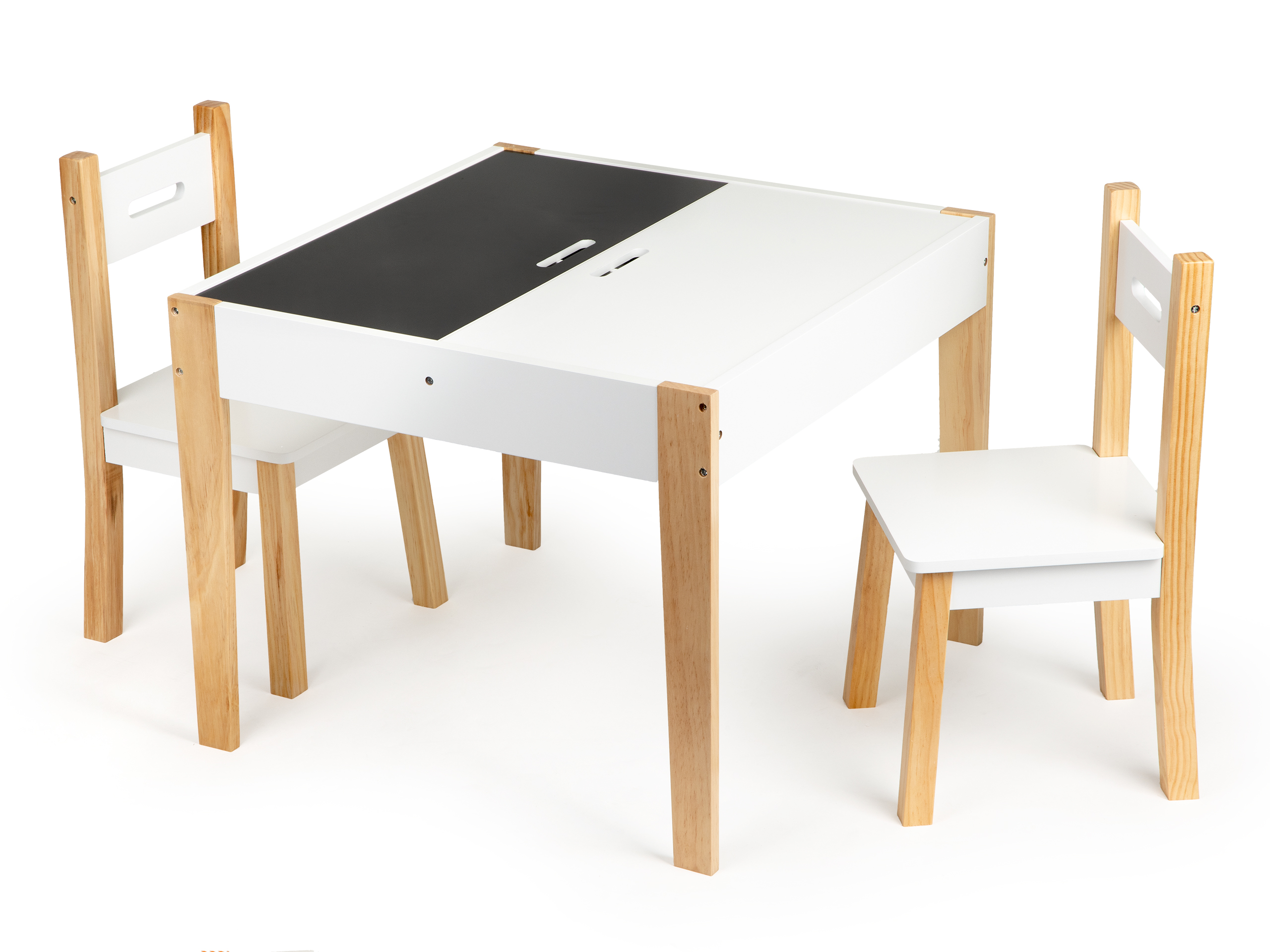 One part of the table top can be turned into a chalkboard, just turn it over and it’s ready to use.