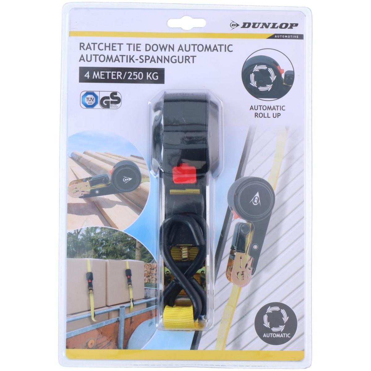 With the 250kg 4M Dunlop automatic ratchet transport lashing belt, lashing becomes fast, safe and…. pleasant. No more struggling for tension and manual retraction. Just one click and the rest does itself.